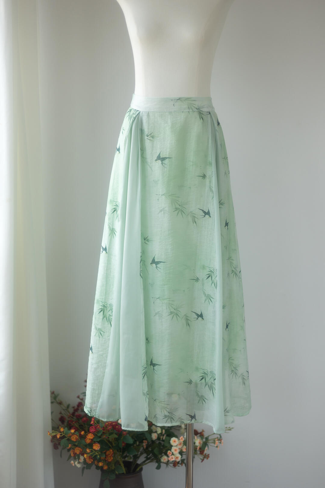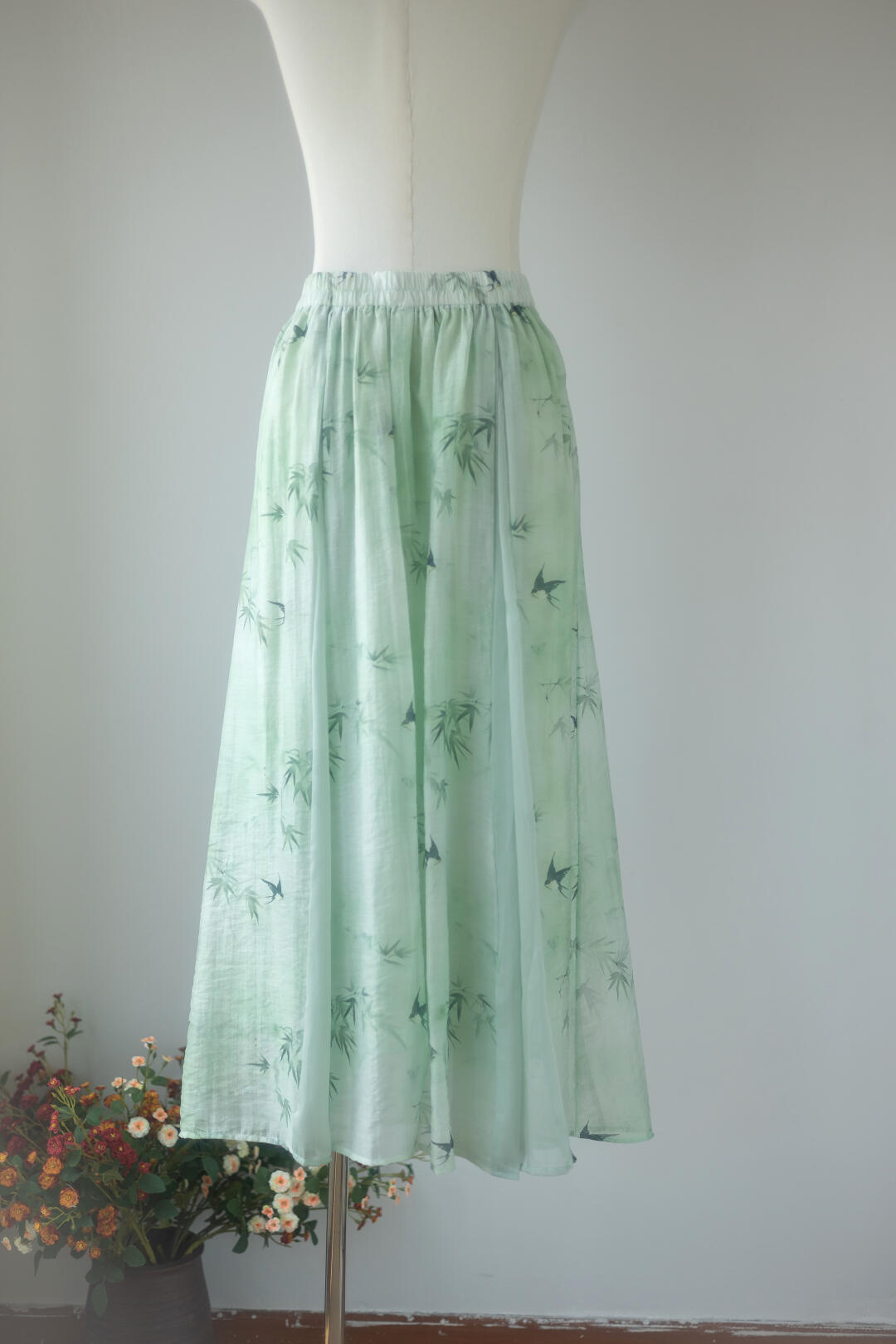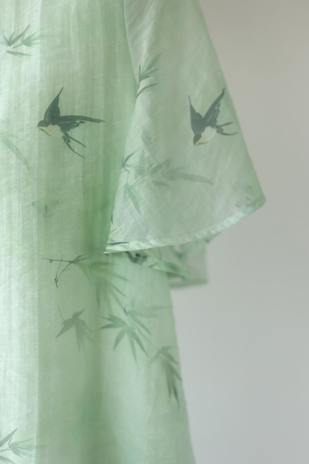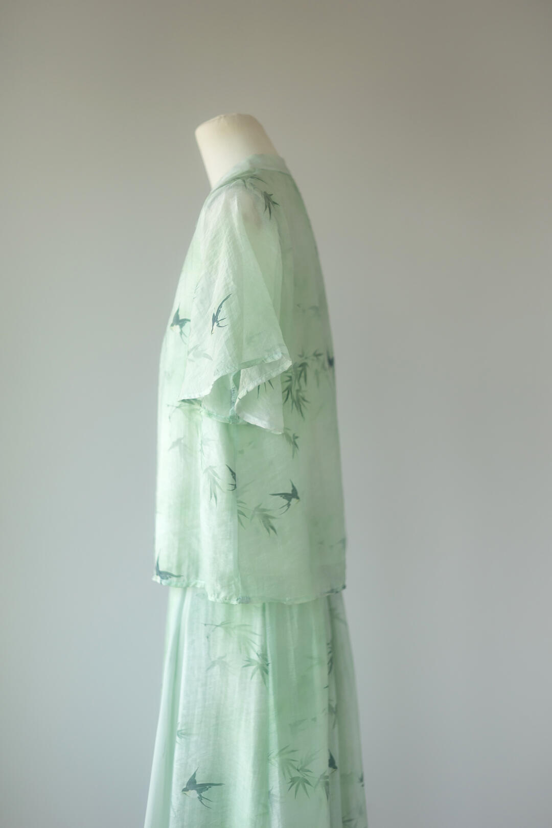 绿色同色系搭配在夏天就是视觉降温 直接变身氧气少女~ 既有端庄仪态,又有松弛感 搭配竹叶燕子图案更加治愈✨ 衣长53左右 ,裙长90cm,150cm 宽松版型,对身材包容性妥妥的~ 3️⃣码/现货库存 -