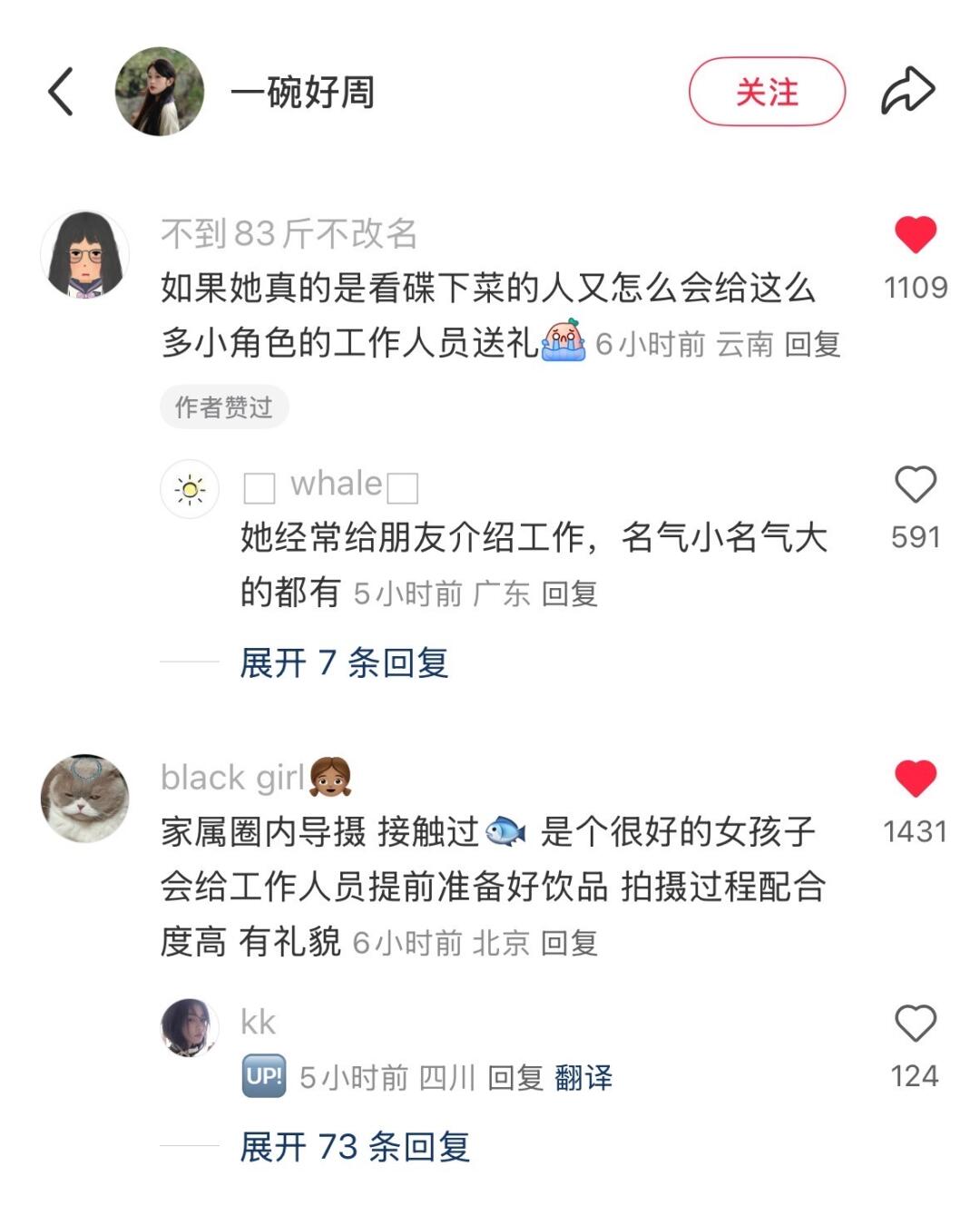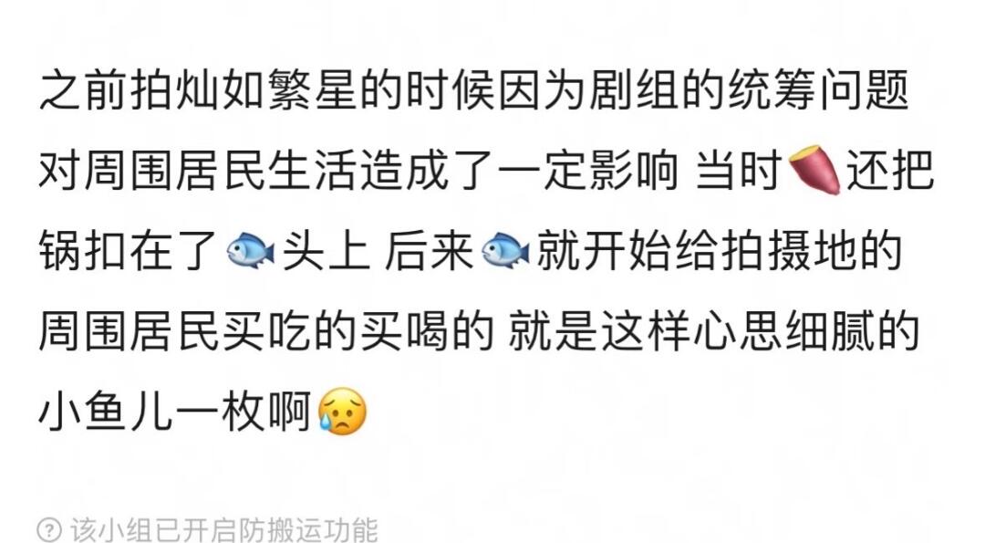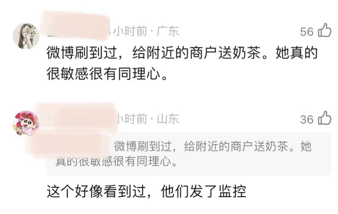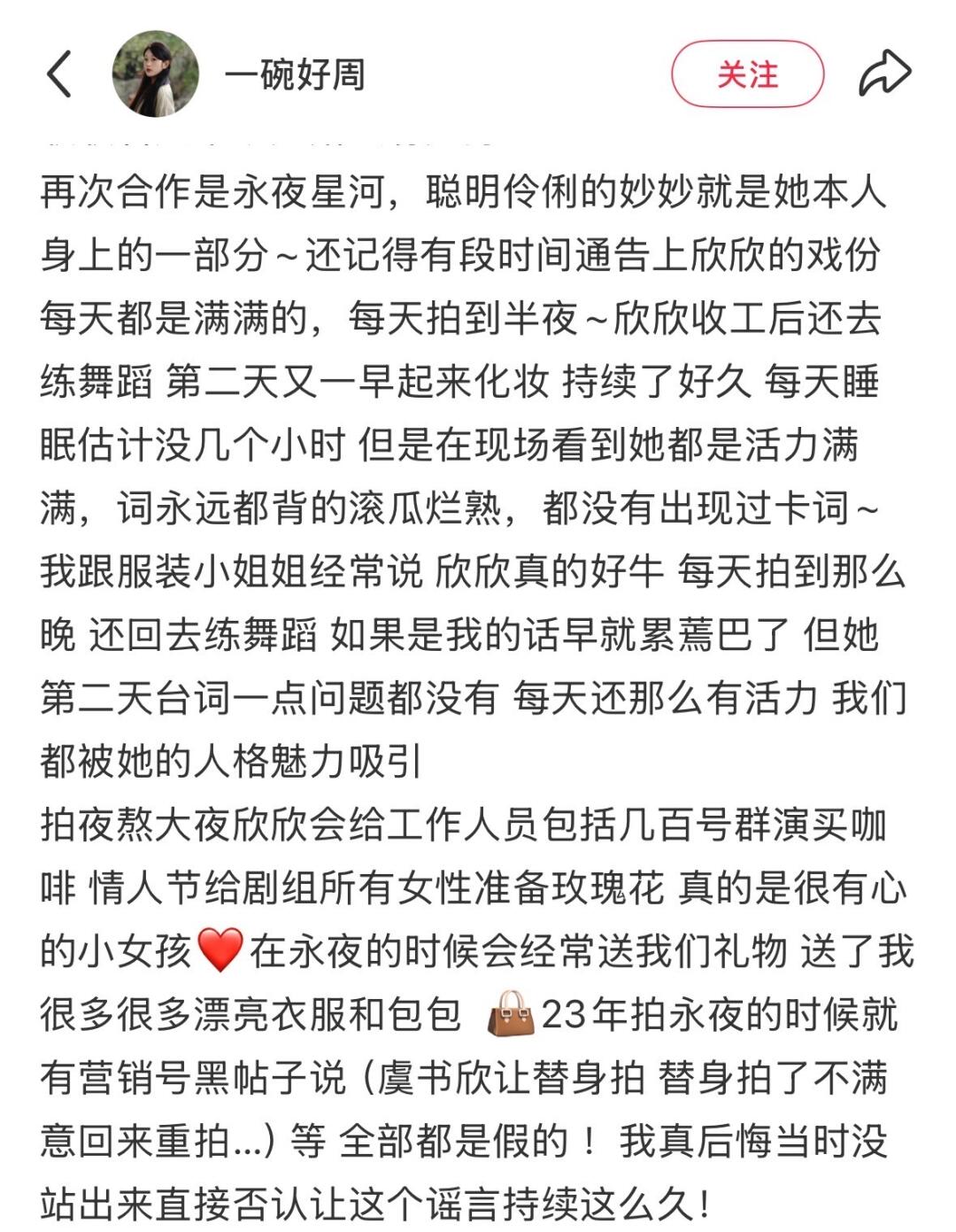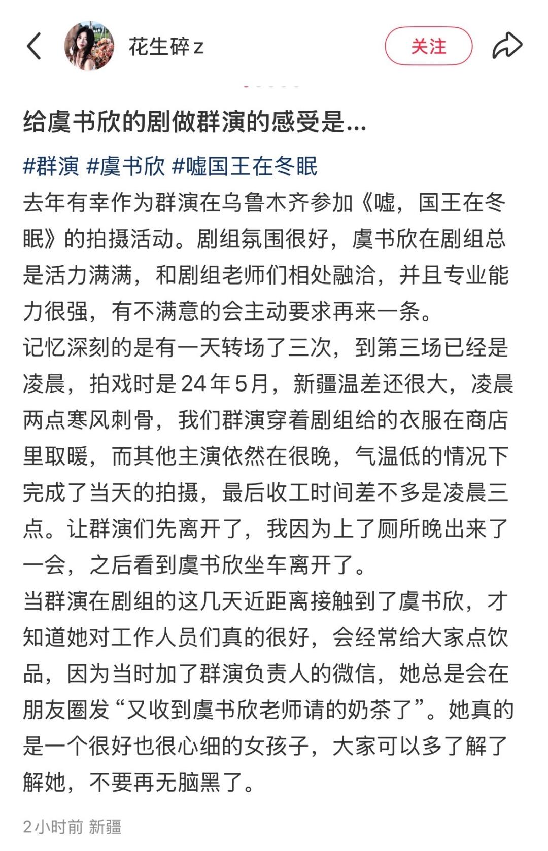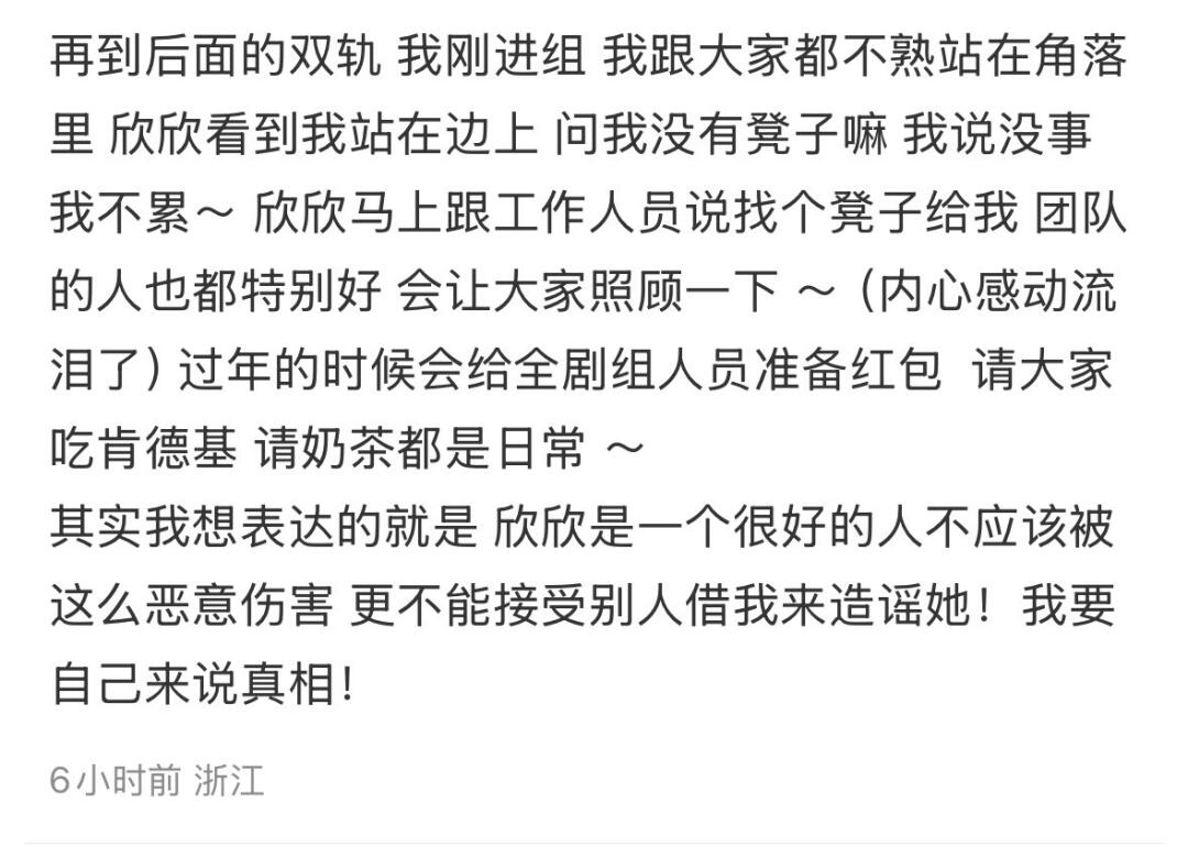 当群演在剧组的这几天近距离接触到了虞书欣,才知道她对工作人员们真的很好,会经常给大家点饮品,因为当时加了群演负责人的微信,她总是会在朋友圈发“又收到虞书欣老师请的奶茶了”。她真的是一个很好也很心细的女孩子,大家可以多了解了解她,不要再无脑黑了。”