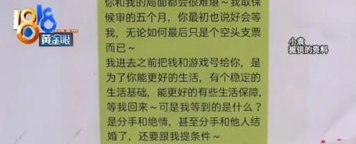 安徽一男子蹲4年监狱,这期间,委托处了8年的女友卖掉游戏装备,卖了25万,加上别的一共37万,都在女友手里。 3年后,女友提分手,男子怕女友不给钱,将就就计拿回27万,2025年,男子出来后,想问前女友要回剩余的10万欠款,而前女友回复让他无奈。 小袁出狱后连手机都没有,只能借店老板电话找前女友要钱,心里还惦记着爷爷。前女友直接怼他:“你都起诉我了,有话去跟法官说!” 那10万是小袁的全部指望,前女友却咬定这是8年青春的补偿费。最扎心的是爷爷桌上那袋过期桃酥——小应当初答应常去看老人,结果去了两次就再也不露面。 曾经分一碗泡面都舍不得让对方吃苦的人,如今连10万救命钱都要扣下。小袁打印了游戏充值记录准备打官司,可皱巴巴的信里“等你出来”几个字,比判决书更刺眼。