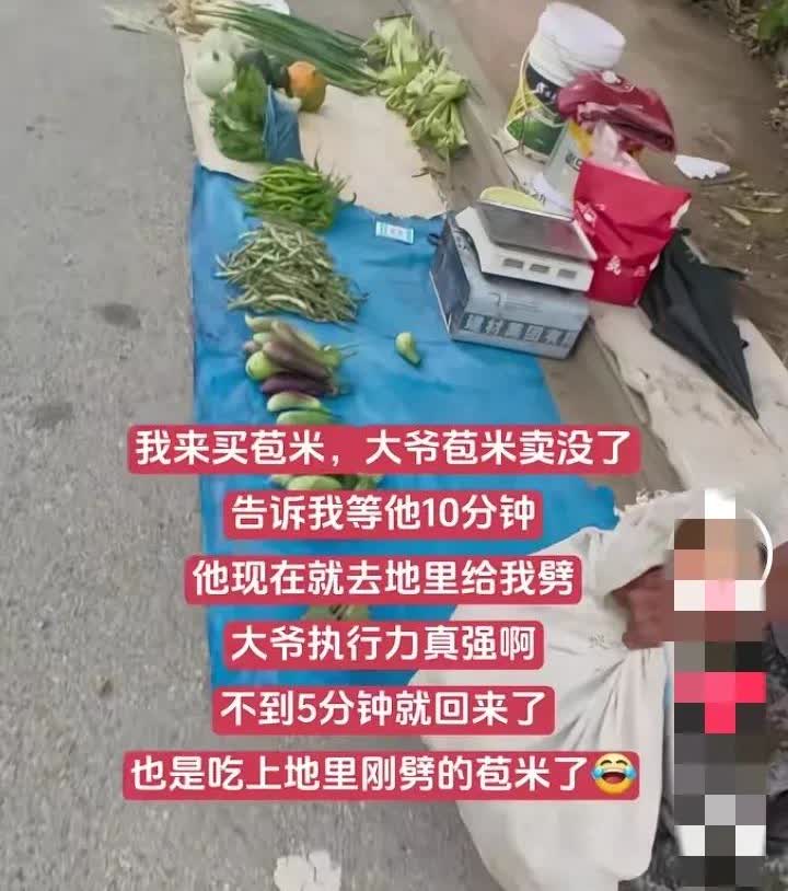 8月21日,辽宁,一名女子骑车回家,看见路边有一个卖苞米的老大爷。女子问还有苞米吗?大爷说,没了,你等我10分钟,我去地里给你现劈,说完大爷骑车就走了。 原本以为得等一会儿,没成想不到5分钟,大爷骑着三轮车又回来了,车兜里拉了半袋子苞米。女子打开一看,全是新鲜的苞米,绿油油的带着股子清香味儿。 剥开苞米叶子,饱满的颗粒排列得整整齐齐,掐一下汁水四溅。这份刚出地的新鲜味儿,混着大爷的实在劲儿,让女子心里非常感动和开心,不由地夸了大爷几句,老人笑得差点没要钱。 看了视频,大爷这执行力没得说,说去地里劈马上动身,还提前五分钟送回来,这股子实在劲儿太让人暖心了,手脚麻利的不像老人家,眼里全是对买卖的认真劲儿。 刚从地里摘得苞米带着清香味,看着就知道很新鲜。大爷不但讲信用,关键是把顾客的事儿当事办,这份实在太难得了,必须给大爷点个赞!