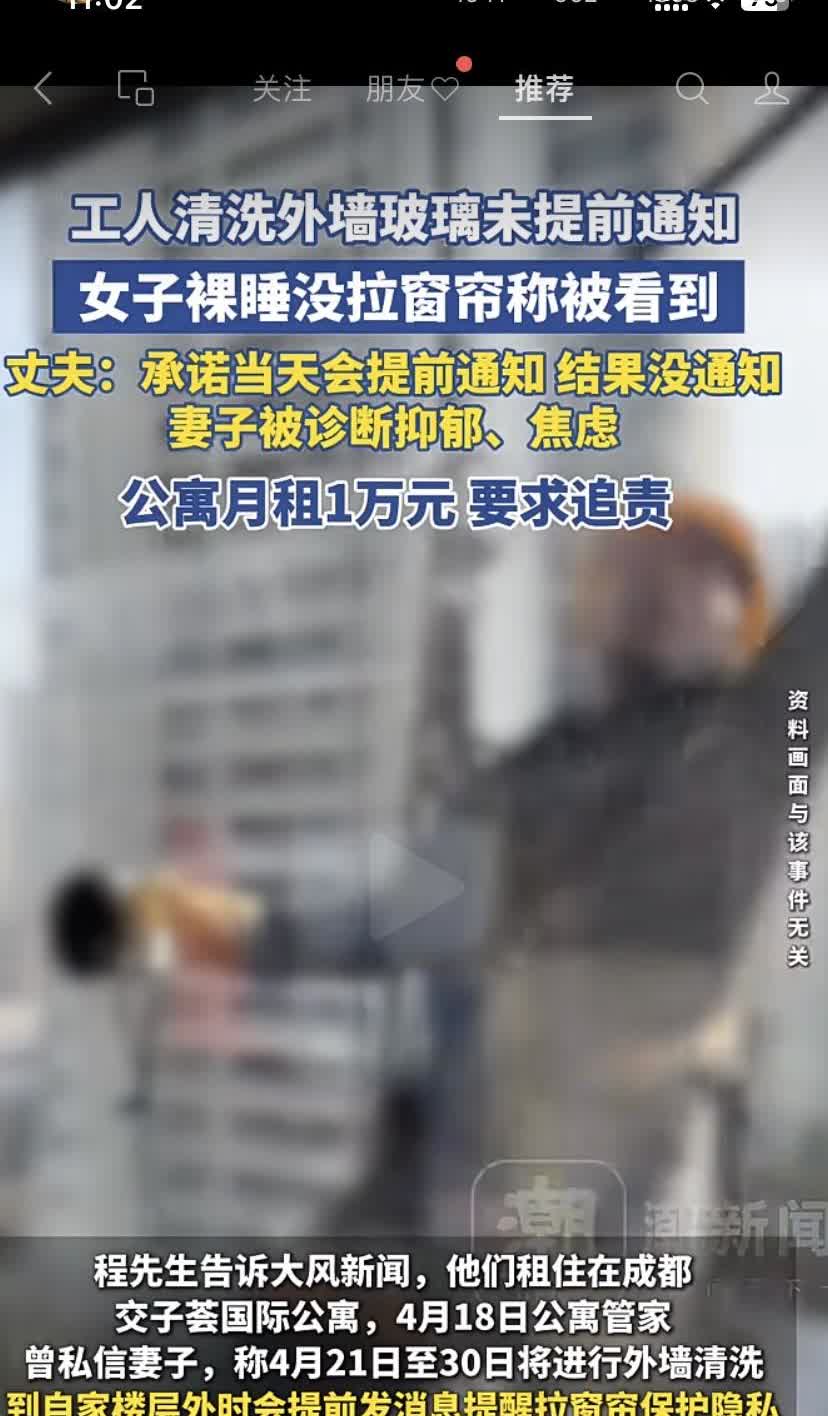 女子裸睡没拉窗帘,被两名男工人看光,这谁能受得了?本以为能有靠谱的管理。公寓明明承诺清洗外墙时提前通知,结果还是出了岔子。 事发近4个月都没处理好,公寓管理方提出续租每月优惠600元,这简直是打发人。他妻子都被诊断出抑郁、焦虑了