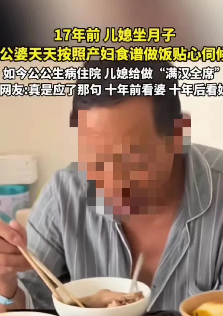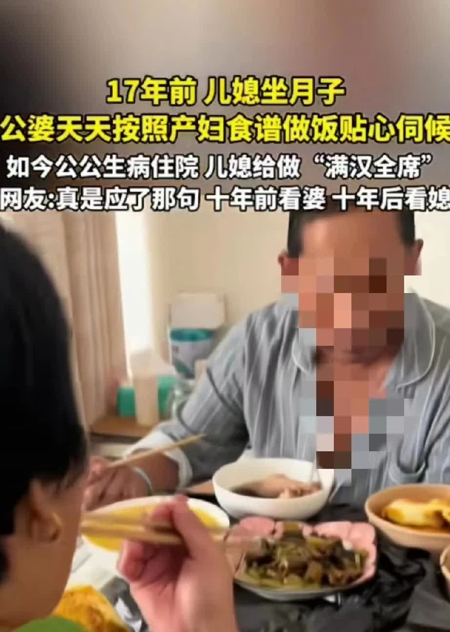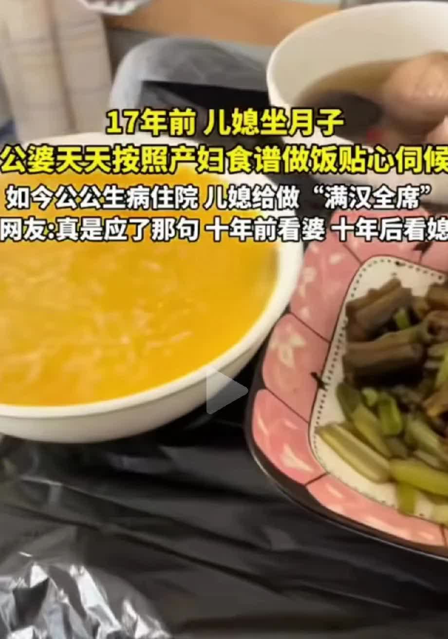 一女子说公公生病住院,婆婆在医院照顾。她坚持每天给公婆送饭。医生说啥我做啥,给公公炖排骨汤,煎馒头片,小青菜炒肉,还有小米粥、南瓜粥。同病房的人都羡慕我公婆有福气,但其实他们不知道,有福气的人是我! 女子说,公公本来住院抑郁,现在状态越来越好,吃饭的时候公公都特意坐起来,把每个菜都摆在小桌上,一边吃一边和病友炫耀! 女子说,所有人都夸公婆有福气,有这么好的儿媳妇,这么热的天,天天都专门做饭,然后送到医院,怕是亲闺女都做不到这份上。 公婆听着别人的夸奖,笑的更开心,尤其是公公,手上的针眼还很醒目,但是脸上的笑容却很幸福,状态一点都不像住院的人,朴实无华的笑容,也让儿媳动容。 女子说,别人都觉得公婆有福气,但其实有福气的人是我,公婆曾经怎么对我,如今我就怎么对他们。 17年前,她生孩子坐月子,那时候条件不好,但是公婆把最好的都给了她。公婆十分上心,婆婆负责专门贴身伺候,公公负责饮食做饭,月子里从没让她抱过一次孩子。 女子说,都是月子里的仇是一辈子,但月子里的恩也是一辈子,公婆从未亏待我们母子,如今公公生病需要帮助,那我自然要好好对待他! 正如网友所说,十年前看婆,十年后看媳!