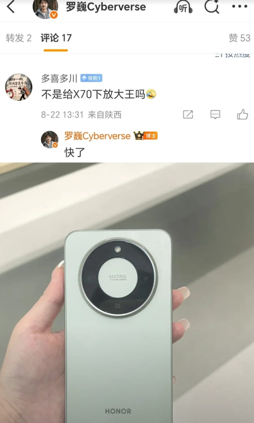 荣耀大王影像要下放给X70?荣耀影像负责人罗巍表示,荣耀大王影像快下放给荣耀X70了,这相当于其他几家的旗舰功能下放给了千元机,友商要不要跟进呢?