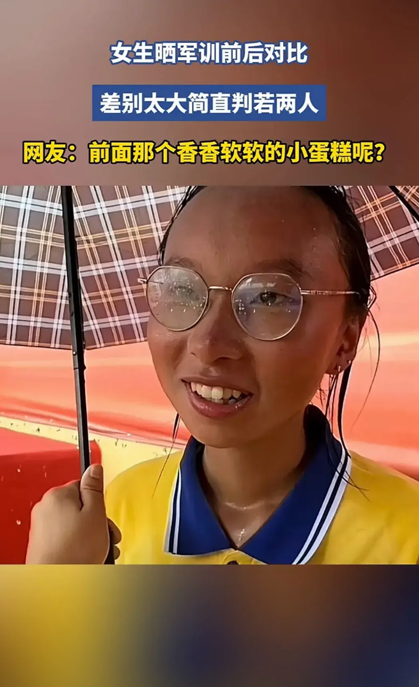 难以置信!山东,一女生参加军训被晒黑,因变化太大,与军训前的样子相比判若两人,训前她样貌清秀,像香香软软的小面包,训后她皮肤黢黑,网友忍不住质疑说:这根本就是俩人!