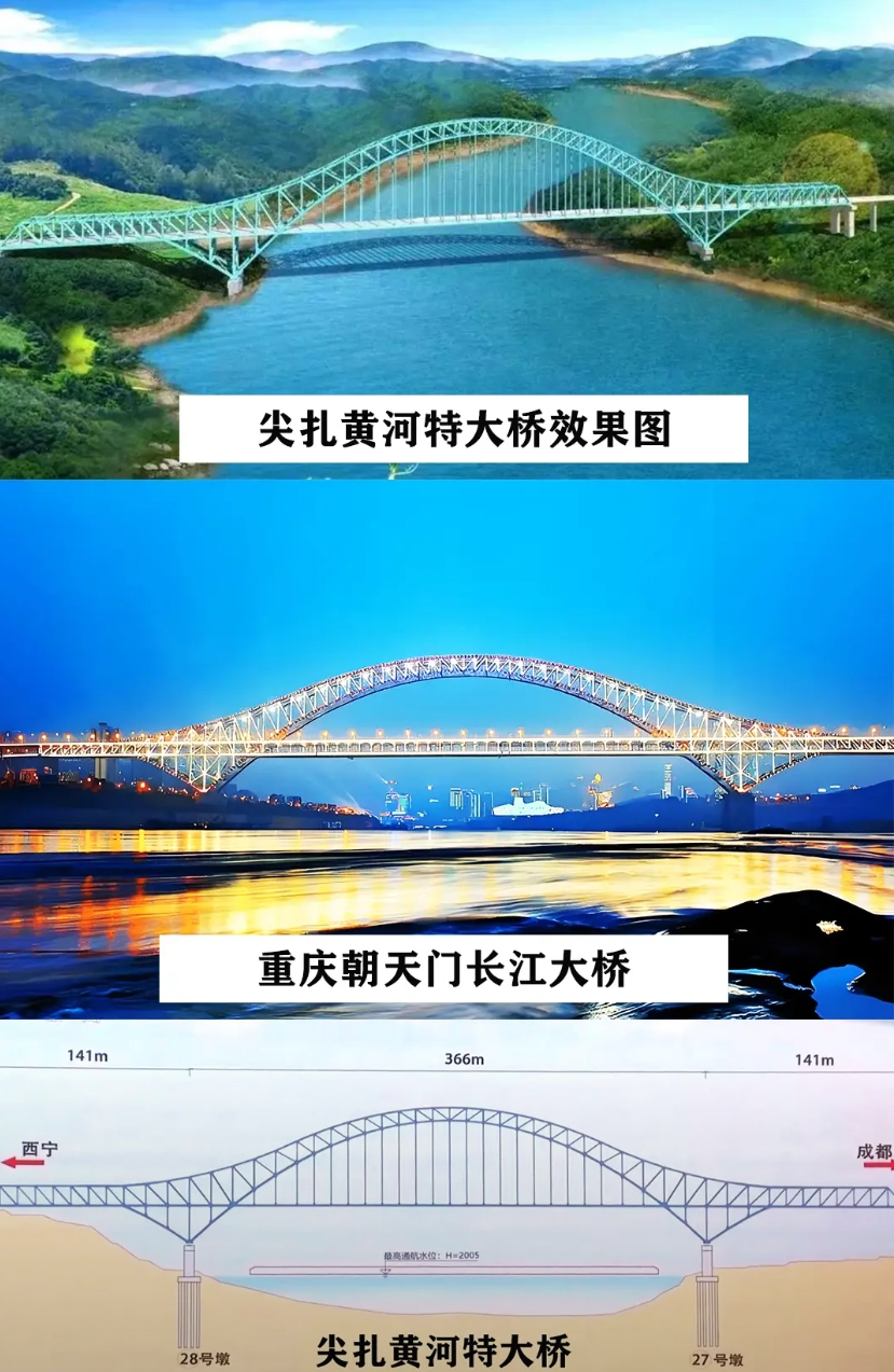 尖扎黄河特大桥竟然是重庆朝天门大桥的复制版!上一篇介绍了几座与尖扎特大桥相似的照片后,我越看这两座大桥长得越像,轮廓几乎一模一样,区别就是朝天门大桥是公路轨道双层大桥,尖扎特大桥是铁路桥。 我查了下资料,这两座大桥都是三跨连续钢桁系杆拱桥,尖扎特大桥全长1596.2米,主跨366米。朝天门大桥全长1741米,主跨552米,跨度更大。 你看尖扎特大桥的设计图(来自央视资料)跟朝天门大桥是不是一样?
