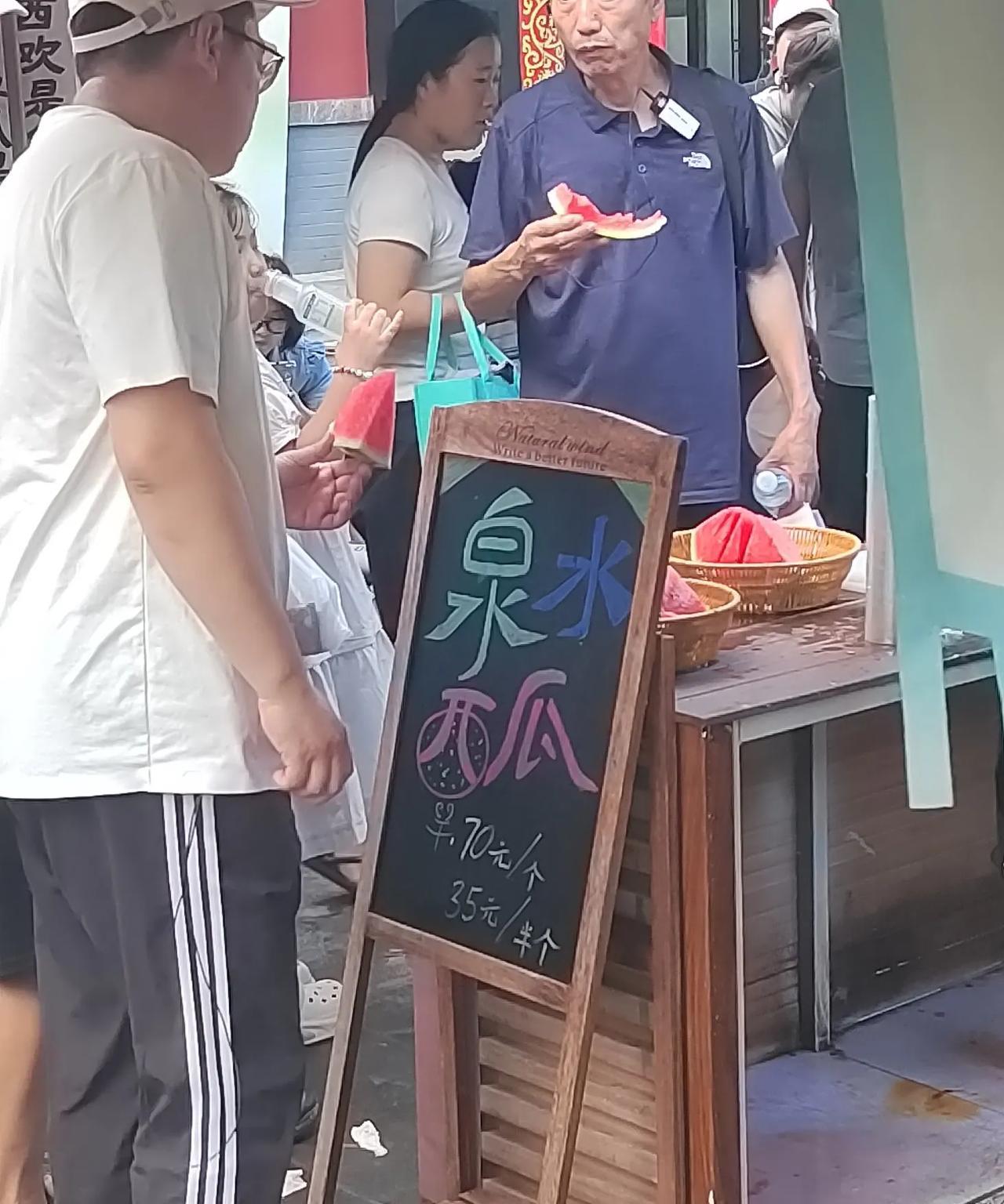 明水古城的泉水西瓜,只能说愿者上钩。 作为家乡的古城,由衷地感到自豪。不管是新建的还是历史遗存,总算没辜负这一片绝世的泉水,至少给后人留下了一块福地。 啥都好,就是没改掉中国景区商品“磨小刀子”的积习。 就说着泉水西瓜,泡在墨泉下的泉池里,一下子身价倍增,70元一个,35元半个! 这价格高得确实离谱,并且整个夏天从未降价! 这不是在泰山顶上,也不是在大漠深处。古城城墙外的农用车上,黄河、内蒙、宁夏大西瓜7毛钱、5毛钱一斤,运进来很难吗? 泉水西瓜,平均一个就算15斤,也合4.7元一斤,一个10斤的,就是7元一斤,这季节,有点过分了。 西瓜在泉水里一泡,凉丝丝的,吃起来确实很爽,但这价格就像开光了一样,让人吃不起。 无奈天热,吃的人还是络绎不绝,出来旅游,谁还在乎百八十的小钱! 一个暑期下来,卖西瓜的发财了,古城的名声却受损。 怎么想都觉得这个价格太不合理,就算品质好的西瓜,在产瓜旺季,2元一斤到顶了。去产地大田里看看,2毛一斤随便拉,进了池子身价翻了几十倍,想不通。 啥时候中国的景区改掉宰客的毛病,文旅业就厉害了!