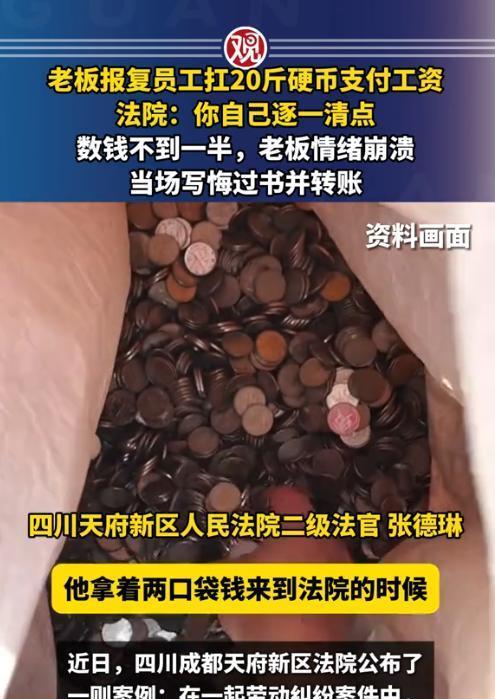 这个法官火了!4月14日,四川一老板拖欠员工8000元工资,败诉后竟试图用20斤1毛硬币羞辱员工!不料法官冷静一句:“您先自行核对金额是否正确。”令老板当场愣住,结局令人振奋! “我辛苦干了活,就想要回自己该得的工资,他反倒用一堆硬币来恶心人!” 四川的李某(化名)捏着被汗水浸皱的工资条,盯着上面明明白白的 8000 元数字,声音带着难以抑制的愤怒。为讨回这八千块钱的工资,他无奈之下将老板谢某(化名)告上法庭。 李某之前在谢某的公司打工,每天天不亮就到岗,忙到天黑才走,搬运货物、整理账目,脏活累活从不二话。可谢某却拖着 8000 元工资不给。李某没办法,只能走法律途径。法院审理后,判谢某得给李某支付这 8000 元工资。 可谢某这人平时就爱耍点小心思,爱占点小便宜,心眼小。觉得自己败诉丢了面子,心里憋着一股邪火,就想报复李某。他脑袋里冒出个损招:用 20 斤 1 毛的硬币来付工资,想着这么多硬币,李某得数到啥时候,折腾折腾他,也算出口气。 4 月 14 日这天,谢某扛着两大袋硬币就来到了法院。那硬币一袋一袋的,看着就沉,往地上一放,叮当响。谢某还故意大声说:“这是给李某的工资,八千块钱一分不少!让他好好数数!” 那语气,满是挑衅。 法官一开始也没料到谢某会来这一出,等看到是两大袋硬币,心里立刻明白谢某的小心思了。但法官没慌,她冷静地看着谢某,说了句:“您先自行核对金额是否正确。” 这一句话,把谢某给愣住了。谢某本来想着为难李某,结果法官这一招,把难题又抛回给他了。 谢某没办法,只能硬着头皮开始数硬币。这硬币一堆一堆的,数起来特别麻烦,数一会儿就容易数错,数着数着,谢某自己都烦了。没数到一半呢,谢某就受不了了,情绪开始崩溃。他本来想羞辱别人,结果把自己给折腾个够呛。 谢某这时候也意识到自己错了,赶紧主动承认错误,还向法院出具了悔过书,然后通过银行转账,把 8000 元工资给李某转过去了。 这事传到网上后,网友们纷纷为法官点赞。 有网友说:“这老板真够损的,拖欠工资还有理了?还好法官聪明,治住他了!” 还有网友说:“这下知道法律不是好糊弄的了吧,想耍心眼,最后坑的是自己!” 也有网友表示:“这样的法官才是真正为人民服务的好法官,祝她健康长寿,好运连连!” 这事儿也给其他老板提了个醒,别想着拖欠工资,别想着用歪门邪道对付员工,现在劳动者维权意识越来越强,法律也越来越完善,老老实实履行自己的义务,才是正道。而对于咱们打工的人来说,遇到不公,别害怕,大胆用法律维护自己的权益,总会得到公正的结果。 对于这件事情,你们怎么看?