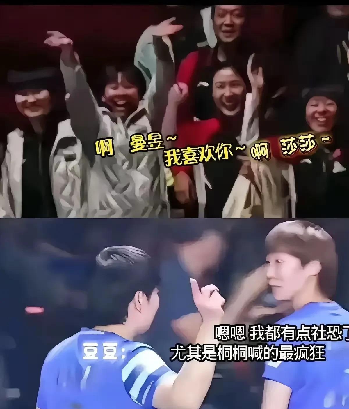 莎莎和曼昱双打夺冠,你瞧瞧观众席上的女孩子,疯了,疯了!她们都为莎莎和曼昱高兴,何卓佳笑得牙花子都露出来了,王艺迪笑得眼睛咪成一条线,陈幸同更夸张,高举双臂,颧骨抬高两厘米,哈哈哈哈哈,所有人都高兴啊,因为莎莎和曼昱打败了日本选手。 我们国乒多团结啊!这样的画面太感人了!好像好久没看到这样温馨的场面了。