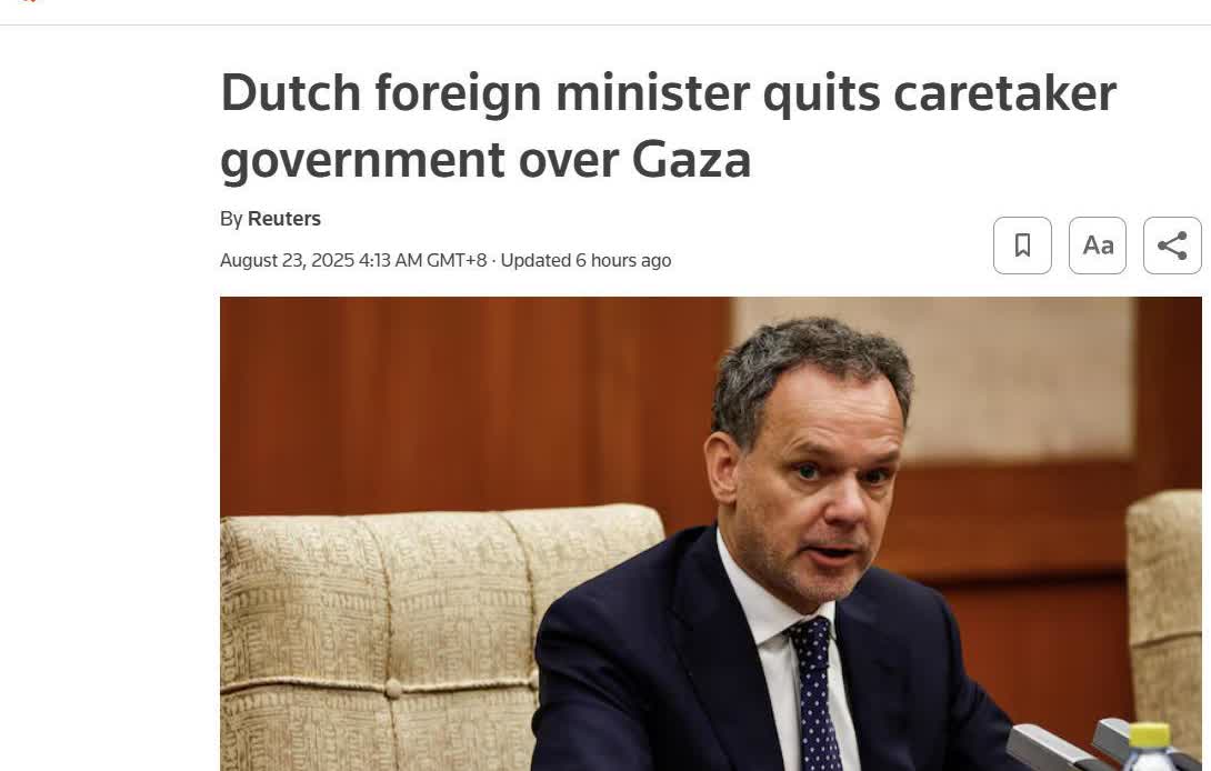 荷兰外长因无法制裁以色列辞职 8月23日,根据路透社的报道,荷兰外交大臣卡