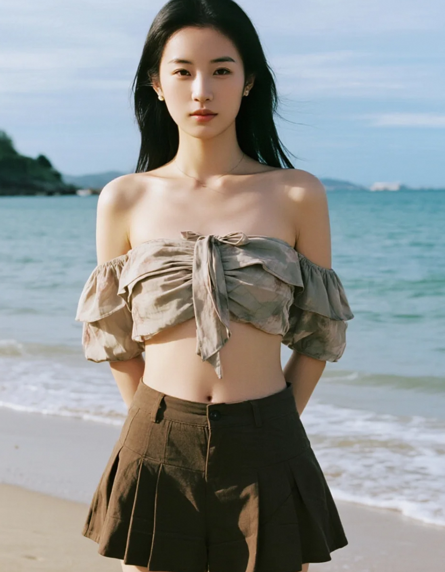 沙滩漫步,长发女神迎着海风,姿态轻盈,诗意流淌心间