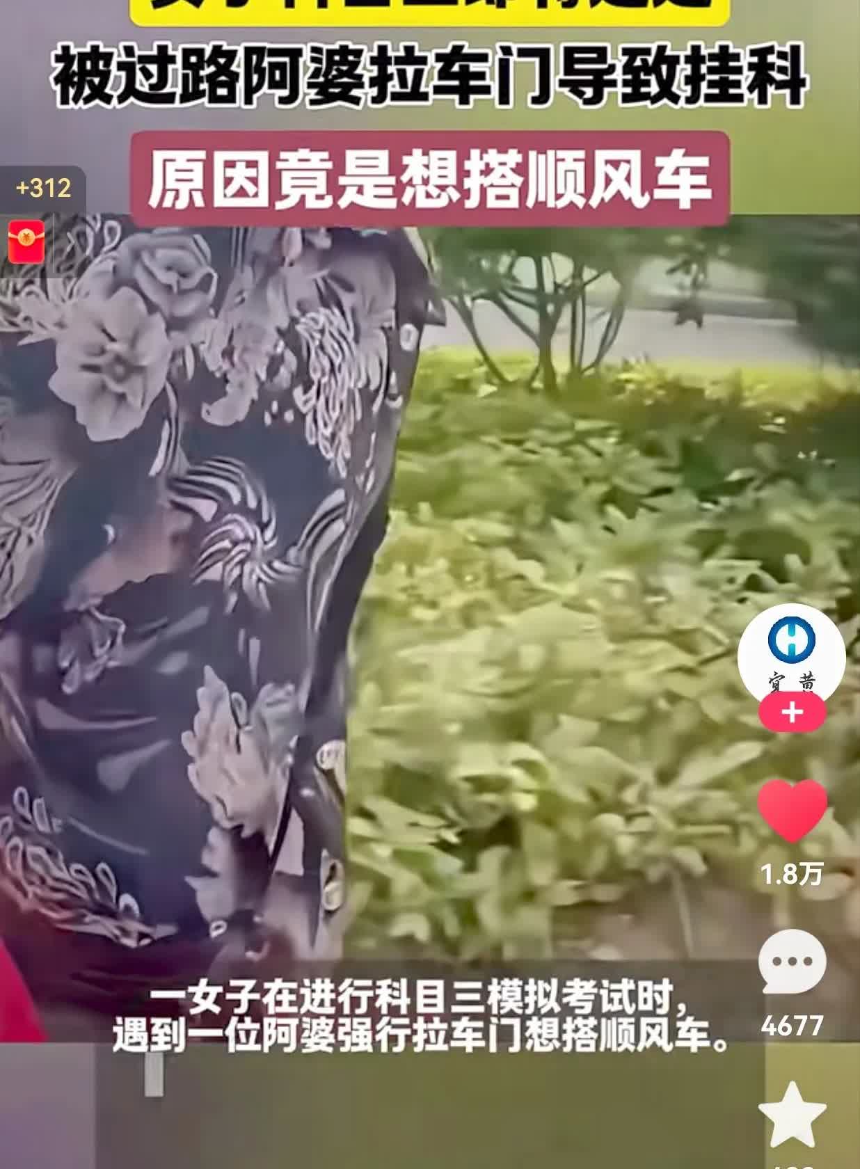 太不讲武德了!女子科目三正在考试,眼看就要通过,被路过的老人一直拉车门,说要搭顺风车。人家多次说这是考试车辆,不能载客,阿婆依旧不管不顾。最终,导致女子考试不合格。网友:这是听不懂人话呢?还是揣着明白装糊涂呢? 一女子正在进行科目三模拟考试,考到了最后一项靠边停车,眼看就要通过。结果,半路上杀出个程咬金。 只见一位老人死死地拉着车门,紧跟着车,一直跟着车往前走。后排乘坐的考生,一直不停地提醒老人。 对老人说:“这是考试的车子,你不要这样搞。” 老人依旧不管不顾,不予理睬,她只是在那里说:“我要搭顺风车。” 后来,女子行驶到定点停车位置停车后,老人迅速拉开了副驾驶车门,随后,车辆语音提示“考试不合格”。 你说谁遇到这种情况不会生气呢?辛辛苦苦练了几天的车,被老人这样一搞,白费劲,考试没有通过。 网友看到后评论说,如果是我考试,遇到这种情况,我会立马下车发飙。 还有的网友说,为什么考试会出现这种情况?不应该查查那些故意的人吗? 真的不明白,为什么有些老人会这么猖狂呢?人家都提醒这么多次了,这是考试的车子,不是搭人载客的车子。 但是,老人依旧不依不饶,嚣张至极!难道人家考试不合格,你就开心了吗?这种人是什么心态呀? 跟着车走,万一出了交通事故,这事算谁的呢?真的太固执了,油盐不进。 我们常说:“听人劝,吃饱饭。”像这种固执己见,自私自利的人,注定成为别人口中的笑柄。 大家有没有见过这种情况呢?欢迎大家评论区讨论留言。