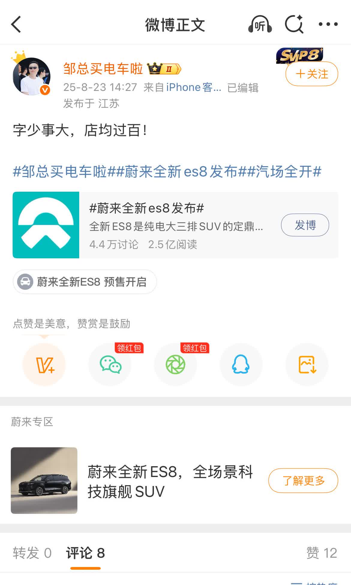 蔚来真的要王者归来了 要重新评估蔚来的位置。目前其实蔚来公司只有一款乐道L90是三代平台车型(ET9不走量直接忽略不计),就已经坐到了新势力第四。三代平台的ES8刚上市两天,小订据说已经破4万,高管确认超过同期L90小订数。 这说明了什么?说明了没有短板的蔚来强得可怕。 过去蔚来NT2.0平台短板是非常明显的,斌哥也承认定义失败,考虑太多创新成本过高,考虑太多欧洲市场。NT3.0平台相比NT2.0平台升级太大,又有技术降本。升级的是用户最最关心的方面,比如性价比、比如大空间、比如舒适性配置标配、比如前备箱、比如大电池。因此蔚来3.0平台新车带来的增量会非常可怕。很多人没概念,带大家回顾一下。二代ES8车长5099、75度电池、没有前备箱、没有超充、没有大彩电卖你50万,顶配100度卖你60万。三代ES8车长5280、102度5C电池、230升前备箱、21寸大彩电、三把零重力座椅卖你预售价41.8万,感受到产品力升级有多么夸张了吗? 现在补齐短板在卖的车型只有L90,周销已经到七千多。那么加上ES8呢,再加上大五座的L80呢。明年再再加上起步价格到25附近,空间更大,舒适配置更齐的新5566呢?蔚来向上,而且向上速度会比所有人都快。