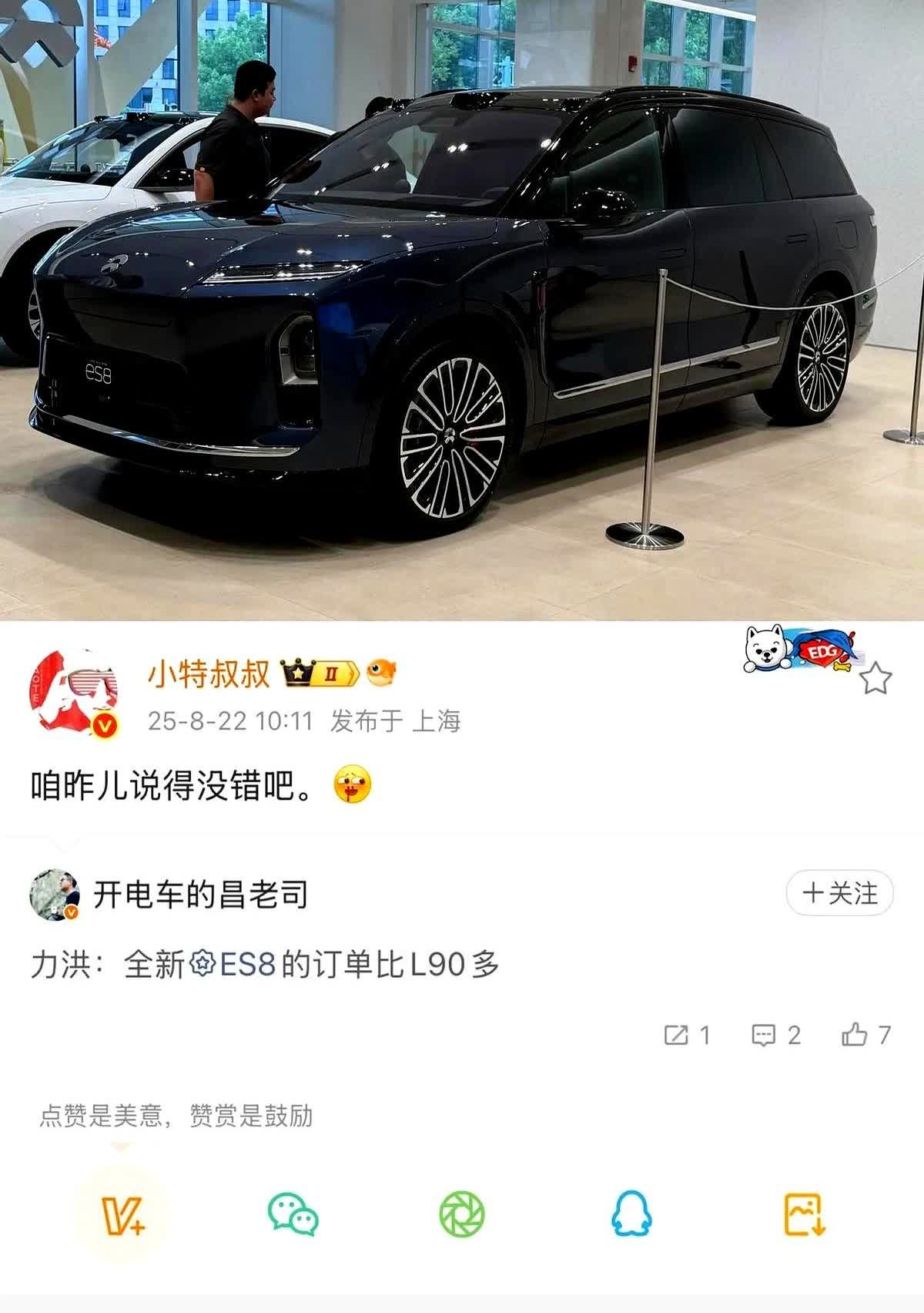 6万台锁单只是前菜,蔚来ES8的订单更猛,20万级纯电SUV要变天 李斌这次把牌打明白了。 乐道L90上市一周锁单6万,价格卡在20-30万区间,砍掉花哨功能,把钱砸在空间、安全、续航,再配可租电池,首付直接腰斩。 这一招把预算紧又想要高端体验的家庭用户全拉进来。 蔚来没动主品牌,用子品牌下探,既保住高端调性,又抢到主流市场。 新款ES8订单更夸张,内部数字比L90还高。换电站烧了几年钱,现在成了护城河。 20多万纯电SUV本来卷得要命,现在又多一个能打的。 钱包有限的用户,选择变多,价格还得再砍一刀。
