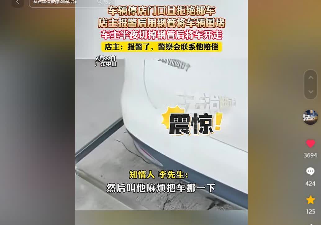 “太过分了!”广东中山,一辆白车停放在男子的建材店门口,男子多次打电话联系车主挪车,车主表示没空并拒绝挪车,男子报警后用钢管将车围住,不料车主大半夜偷摸切掉钢管将车开走。网友:店主还是太善良了。 在广东中山,有个开建材店的李老板,6月22日一大早去店里开门做生意,结果发现店门口被一辆白色小车给堵得严严实实,顾客都没法进出。他看了看车,发现上面有电话号码,就打了个电话过去,想让车主把车挪开。结果车主冷冰冰地说他没空,等有空了再处理。李老板想着大家都不容易,就等等呗。可到了中午再打电话,对方不仅不接,后来还直接关机了。 李老板没办法,只好报了警。警察来了以后,也是想尽办法联系车主,但车主就是不理不睬。警察看车主这态度也太差了,就让李老板找了几根钢管,把车给围起来,省得车主偷偷开走。结果这车主倒好,晚上趁着没人,带着工具把钢管给剪了,把车开跑了。这事儿一出,大家都议论纷纷。第二天早上,李先生一看这情况,又气又没办法,只好又打了报警电话。现在警察正在找车主呢,要让他赔因为切钢管造成的损失。 到了这一步,李先生虽然一直忍着,但对方却一点不在乎,还挑衅他。网友们都说:“这店主也太好说话了!”碰到这种无理取闹的人,讲道理和忍让,有时候反而让对方觉得可以随便欺负人。