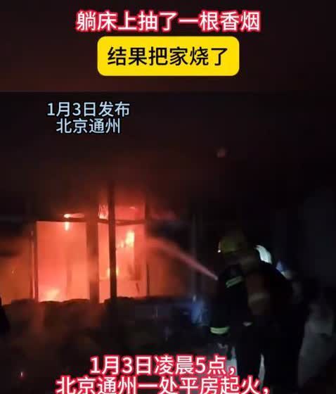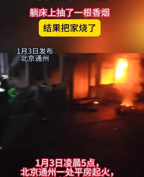 北京通州,男子凌晨做了噩梦突然被惊醒,醒来后总觉得心有余悸坐起来缓了好多一会,等到他缓和好后就躺在床上点起了一根香烟,因为火花落到了床单他并没有注意,没过一会儿火势就大了起来,男子也来不及灭火,只能穿着厚衣服往外跑,眼睁睁看着自家的平房都烧着了,最后等到消防员来花了7分钟才把火全部灭掉。 早上四点钟,在北京通州的一个老旧的平房里,周围静悄悄的,大家都还在梦乡里呢。突然,有个男的被噩梦吓醒了,心跳得飞快,头上直冒冷汗。他赶紧坐起来,好一会儿才慢慢平静下来。但梦里的恐惧还在心里头转悠,他就顺手拿了根烟,点上深吸一口,想让自己别太紧张。他就这么躺着,烟头在黑暗中一闪一闪的。 可没想到,一不小心,火星子掉床单上了。一开始只是个小焦点,但火很快就悄悄烧了起来。等这男的发现不对劲,火已经控制不住了。屋子里烟越来越大,热得要命,他吓得赶紧披上厚外套往外跑,结果回头一看,卧室已经被大火吞没了。他光着脚站在门外,吓得魂都没了,只能眼睁睁瞅着自己的家被大火吞没。他使不上劲儿去救火,只能赶紧打电话报警。没过多久,消防车就带着响亮的警报声来了,消防员们忙了7分钟,终于把大火给灭了。可再看他的家,已经变得认不出来了。 还好他住的是单独的平房,火没烧到别人家,也没人受伤。不然的话,那可就麻烦大了。这场大火啊,就是因为一根烟惹出来的。这事儿告诉我们:睡觉前抽烟,别看是小事儿,其实可危险了。为了自己和大家的安全,还是别在床上抽烟了,最好是能把烟给戒了。