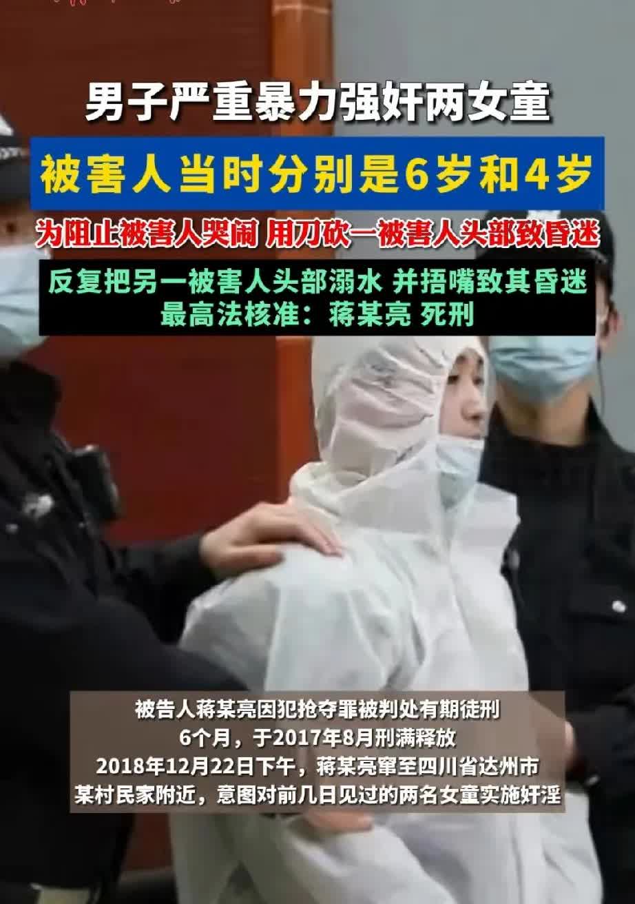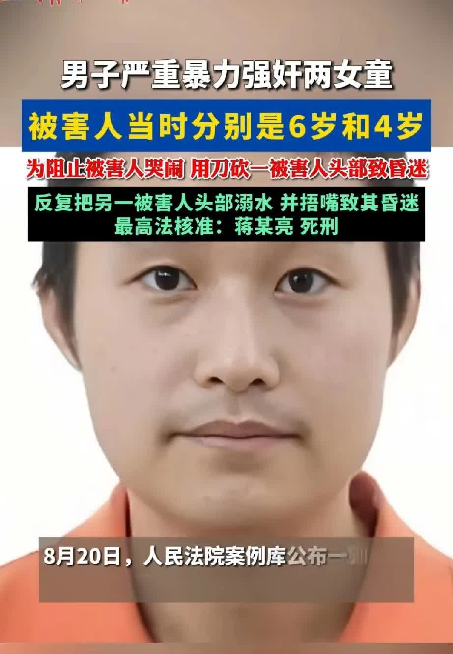 因抢夺罪判刑6个月刚出来,又对6岁和4岁的小女孩实施侵犯,简直不是人! 男子严重暴力强奸两女童 被害人当时分别是6岁和4岁 为阻止被害人哭闹 用刀砍一被害人头部 致昏迷反复把另一被害人头部溺水 并捂嘴致其昏迷最高法核准:蒋某亮 死刑 两个女孩,一个4岁一个6岁,是人都不会对这么小的孩子产生邪念,可是这个将某亮不但实施了侵犯还暴力严重伤害了孩子 看到这个新闻都觉得很愤怒! 他倒是判死刑了,这两个孩子怎么办呢? 还那么小,人家的一辈子可怎么过呢? 一辈子都活在阴影里吗? 人是干不出来这种事的,他就是一个十恶不赦的恶魔