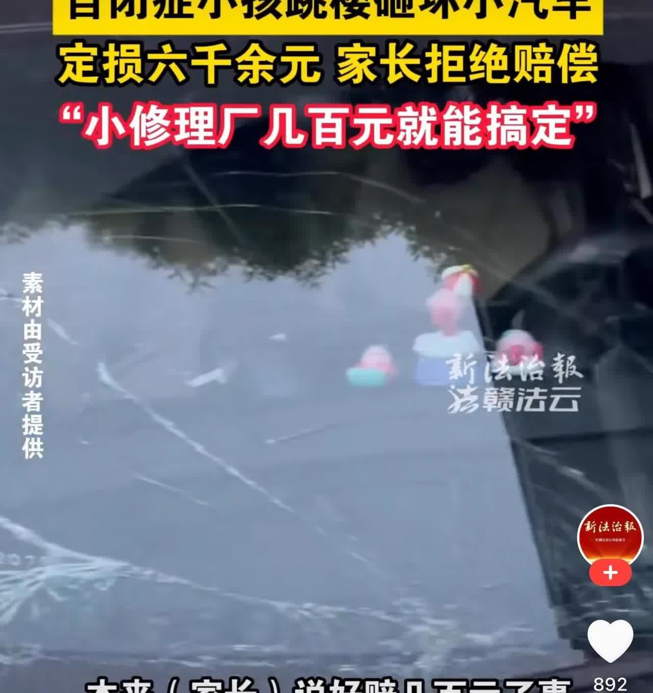 江西南昌,一女子将新买的车子停在楼下,谁知二楼的小孩跳楼的时候,直接砸坏了车窗玻璃,虽然女子损失惨重,万幸孩子只是轻微擦伤,保险公司定损了6000多元,可是,小孩家长却认为,找个小修理厂几百元就能修好,协商无果后,小孩家长竟然表示不赔了。 2024年,江西南昌一小区,黄女士刚到手没多久的爱车,就那么乖乖停在楼下享受宁静。结果,二楼蹦出个自闭症小朋友,直接从窗户一跃而下,跟黄女士的车来了个“亲密接触”,车前挡风玻璃瞬间变成了蜘蛛网,车身也多了几个坑坑洼洼。好在小朋友只是蹭破点皮,没啥大碍。 黄女士心疼得要命,赶紧把车拖到4S店。师傅一看,说修好得六千大洋。保险公司那边也确认了损失。可孩子他爸一听,眉头一皱,说:“怎么可能,几百块钱就能搞定!”然后就是不愿意掏钱。两人磨破了嘴皮子也没谈拢,黄女士一咬牙,决定找保险公司,孩子他爸则淡定回了一句:“行,等法院的信儿吧。” 这事儿一出,大伙儿都炸开了锅。有人说,新车变成这样,赔几百块不是打发叫花子嘛;也有人嘀咕,六千是不是贵了点,但几百块修修补补肯定不够用。还有人理智分析,要不是这车当了回“肉垫”,小朋友说不定得更遭罪。法律这事儿挺逗,你说孩子一跳楼,不光自己遭殃,还把楼下大爷的宝贝花盆给砸了,这账得找谁算?当然是找孩子他爸妈啦!民法典里头白纸黑字写着呢,小孩不懂事闯了祸,监护人得掏腰包。保险公司要是先垫上了,回头也得找这闯祸的小家伙的爸妈要回来。结果这孩子的老爹,硬是不肯掏钱,但最后啊,法律的大网还是把他给罩住了,自闭症可不是逃避责任的“尚方宝剑”。 这事儿现在可不只是赔钱那么简单了,简直就是一场关于“谁该扛锅”的大辩论。法律这家伙,可不管你是不是心情不好,或者有一大堆理由,它认的就是理儿,谁也别想轻易过关。