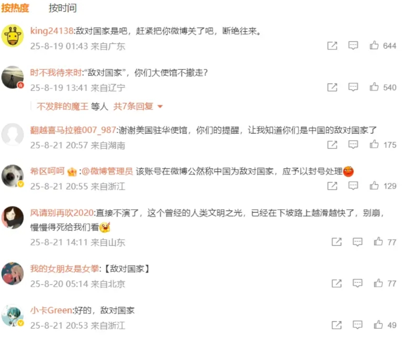 有意思,大老美可能拿够稀土了,压力一下子释放了,于是,又开始作妖了。 据统计,2025年7月,中国对美国的稀土磁铁出口量、环比暴增75.5%,达到了619吨, 只是呢,对我们的这份善意,大老美的回应非常负面,不但新增了对华的制裁手段,还妄称这边是敌国,这个手段看起来比较粗糙,不过其实也在我们的预料之内。 始终明白一点:中美是对手,他们无时无刻不在想着让我们失败,他们是不会眼睁睁地看着我们强大起来的。 8月21日,美国政府以涉嫌帮助运输伊朗石油为由,制裁了13家外国企业和8艘油轮,这里面也包含多家中国的企业。 8月18日,在美国驻华使馆的官网上,老美在微博上直接称中方是敌对国家,无端指责中国向美国输出所谓的“对青年的非法电子烟产品”。 这条微博还在,虽然面对中国网友的一片讨伐,但显然他们心理基础很扎实,就放上面,被我们骂。 当然了,在我们的地面上,称我们为敌人,其实也挺好,给那些还有幻想的人看看,最近2天,这个美国使馆为了应景,在微博上宣扬一些中美二战友谊的博文,被下面网友一片骂,排队骂,这样挺好,提振一下正气,对于这些两面三刀的伪君子,就是不能客气。 中国在全球稀土市场占据绝对控制地位,供应全球近90%的稀土需求,供应的稀土无论是数量还是质量,无出其二。 今年4月,在中美关税战局势升级时,中国对七种稀土元素出口实施出口许可政策,包括钐、钆、铽、镝、镥、钪和钇,道理很简单,老美实在不靠谱,我们也需要要维护我们自己的安全和利益了。 稀土的出口限制,对美国的军工、高科技产业、汽车、电子产业产生了极大的负面影响,生产线停摆,搞得美国相关产业哀鸿遍野、一片哀嚎。 看来,我们又该给老美上上强度了!