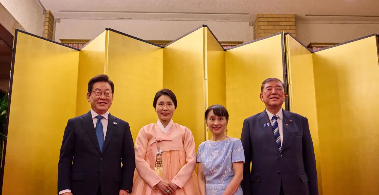 韩国总统李在明与夫人金惠景于23日晚在日本首相官邸同日本首相石破茂及其夫人石破佳