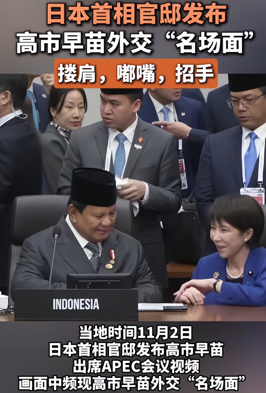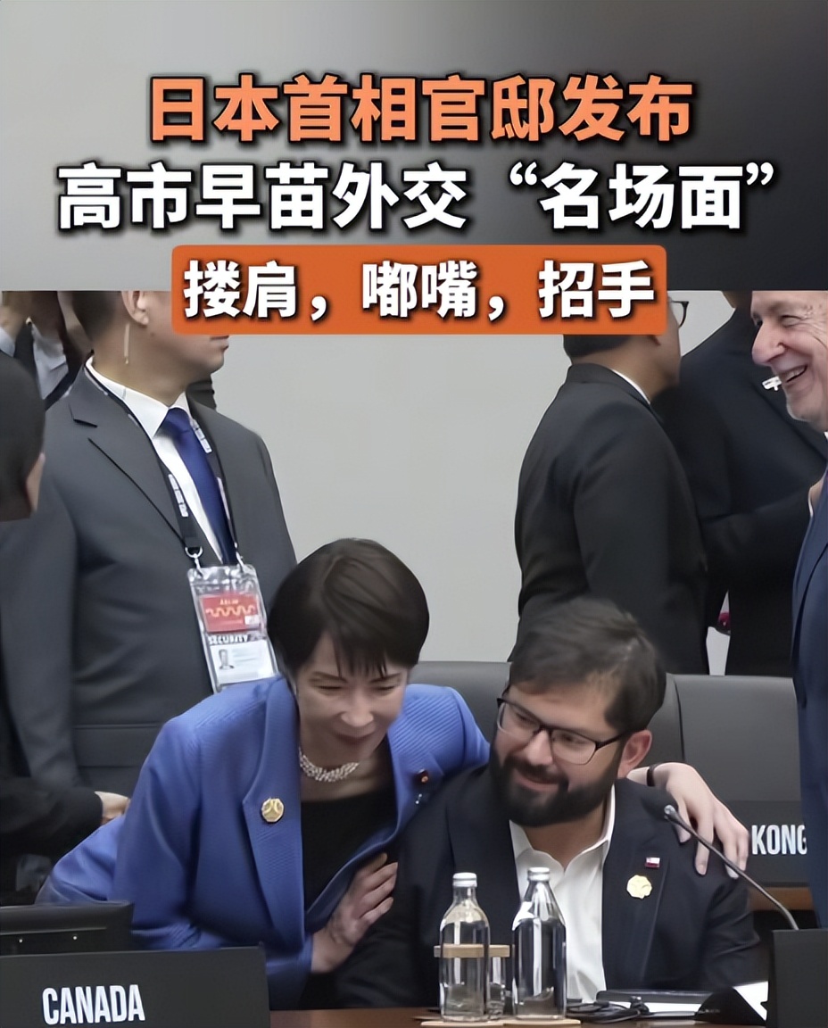 到了釜山APEC会议,高市早苗更是把这种风格展现得淋漓尽致。她主动走向智利总统博里奇,微笑着把左手搭在对方肩膀上。