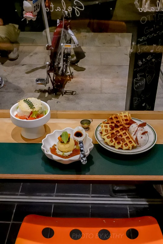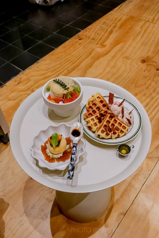 海胆乌梅醋冻斑斓wasabi泡沫 培根gelato枫糖松饼Q ricotta罗勒松子橄榄油佐发酵番茄啫喱 每一个都好癫[汗颜R] 但也很有特色的好吃……