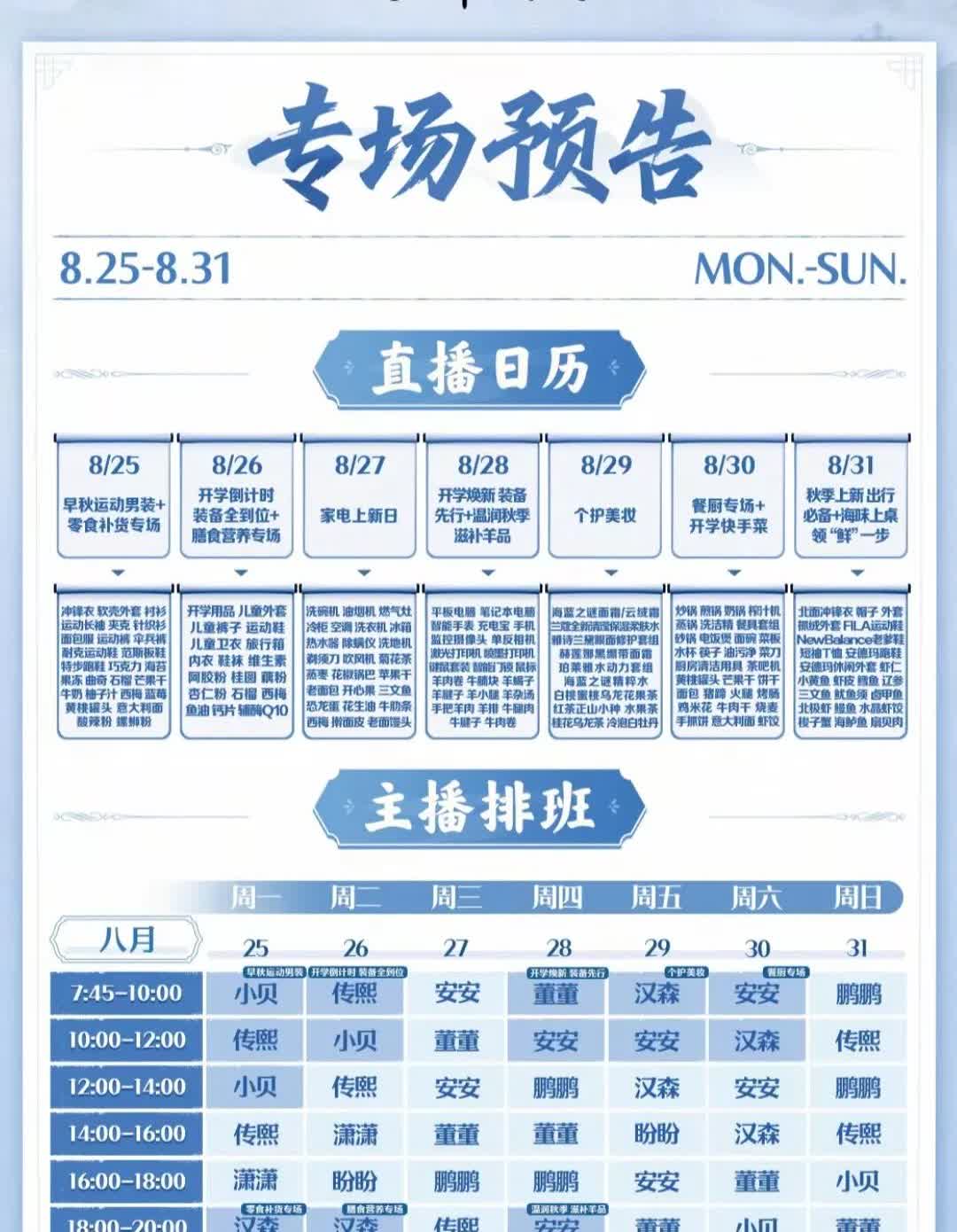 与辉同行和兰知春序下周的排班表,董宇辉消失得无影无踪,有朋友不解,这暑假都快结束了,彪哥去哪了? 难道又被龙洋拉走了,上次听说要去新疆录节目,因为阅山河一直没空,今天终于把亚宠展忙完,应该有时间了。 有朋友问,上次浙江录的《山海寻味》还没剪好吗?到底什么时候播?期待很久了。 看了这两个号的排班,下周小兰有五场“游知万物”,直接排满,鹏鹏和潇潇负责,北京的这些景点,看来得一一走个遍,大家有得看了。 最近几天真真一直单播,状态非常好,成长很快,又喜欢健身,身体素质杠杠的,下周继续。 而大号,依然是八位主播,每个人安排的明明白白,大家的排播都一样,劳逸结合。