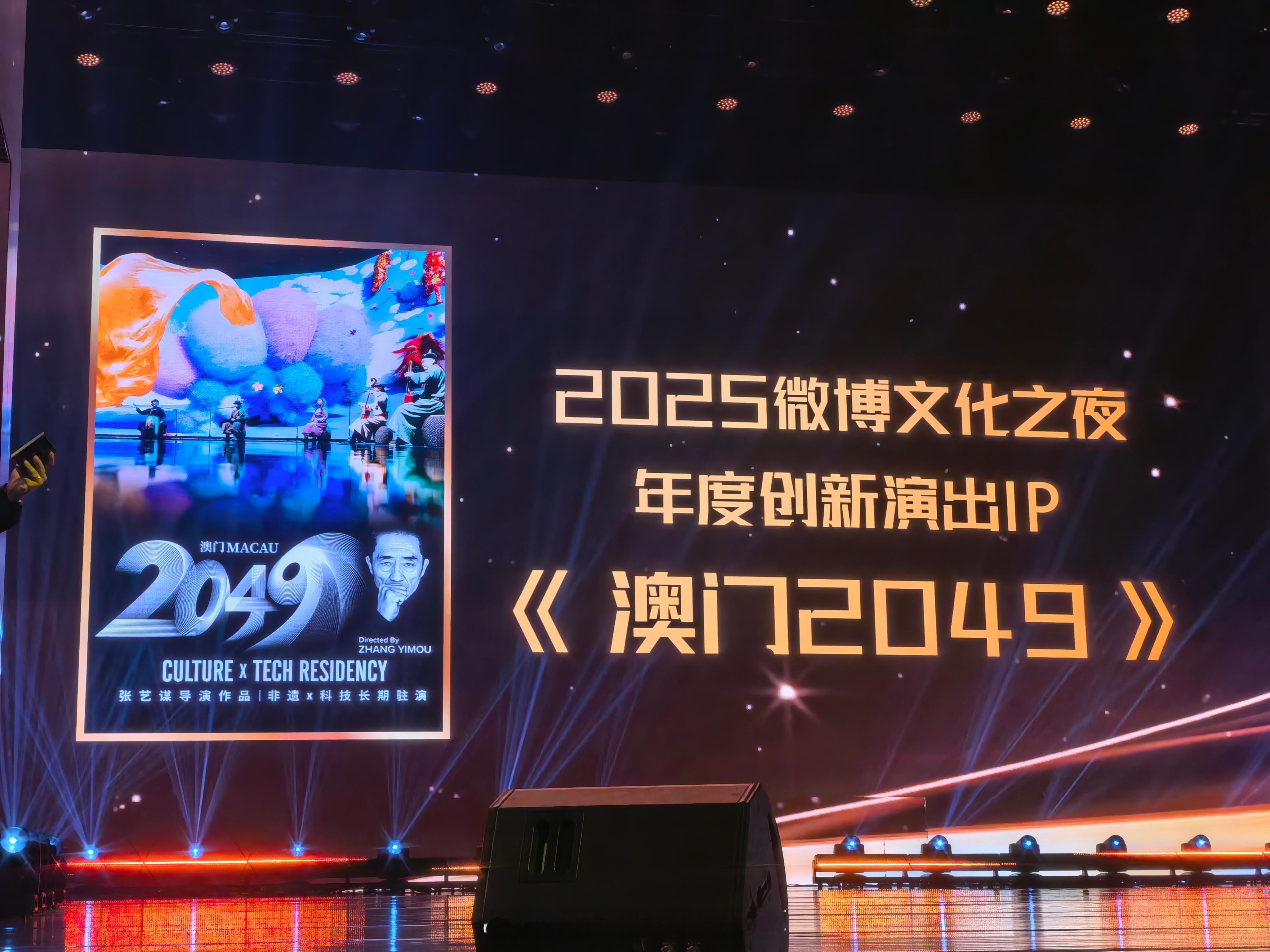 在这次的2025微博文化之夜,我们曾经在澳门看过的《澳门2049》获奖啦 - 年度创新演出IP,实至名归!澳门2049点亮微博文化之夜