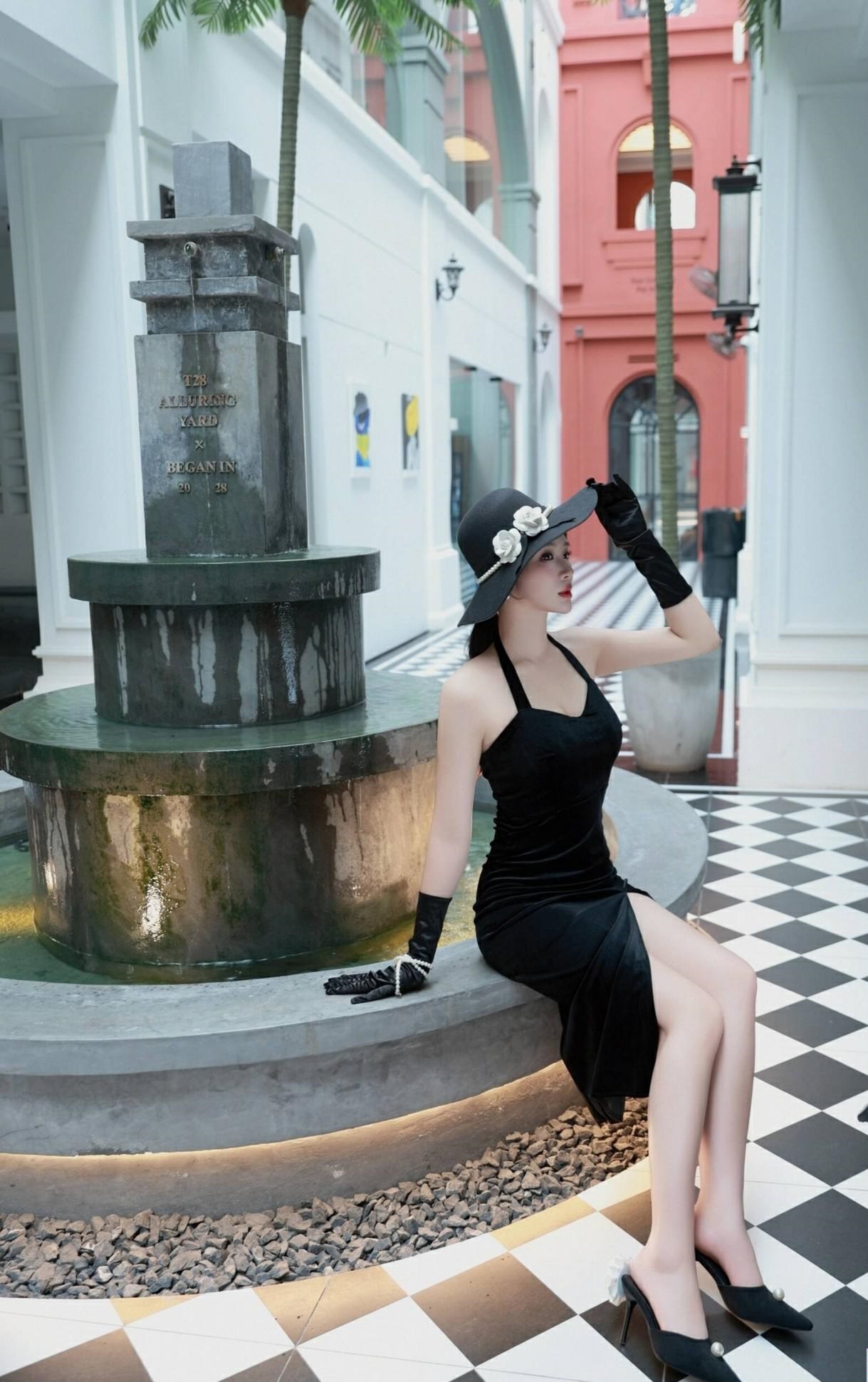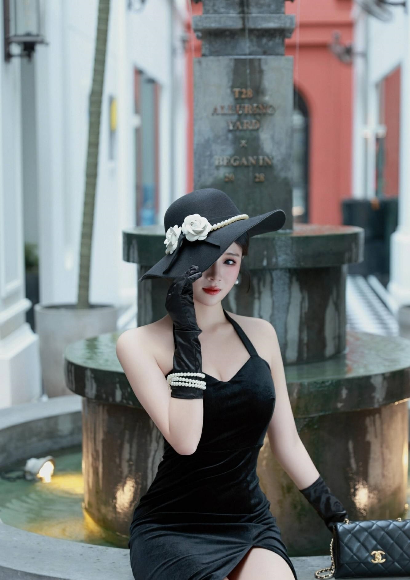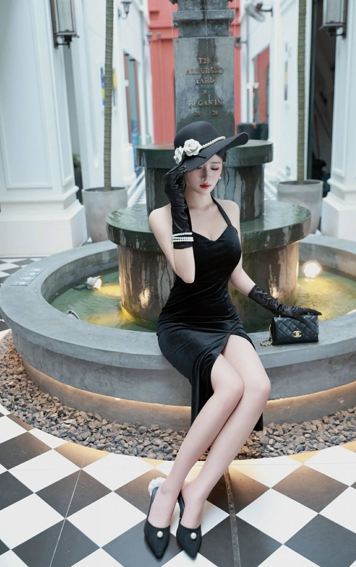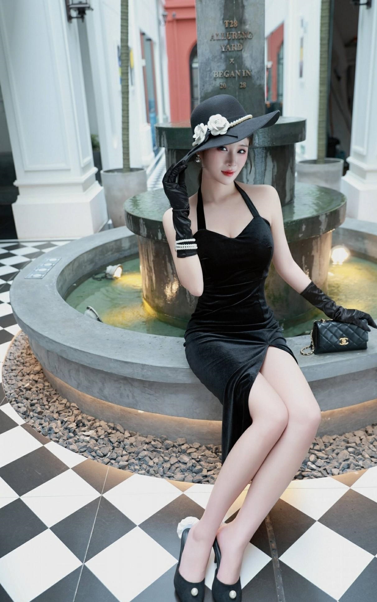 她坐在格子椅上,轻抬玉手,眼神迷离;或倚靠喷泉旁,手扶帽檐,姿态万千。黑白格子地面与复古建筑背景,更添一份怀旧韵味。
