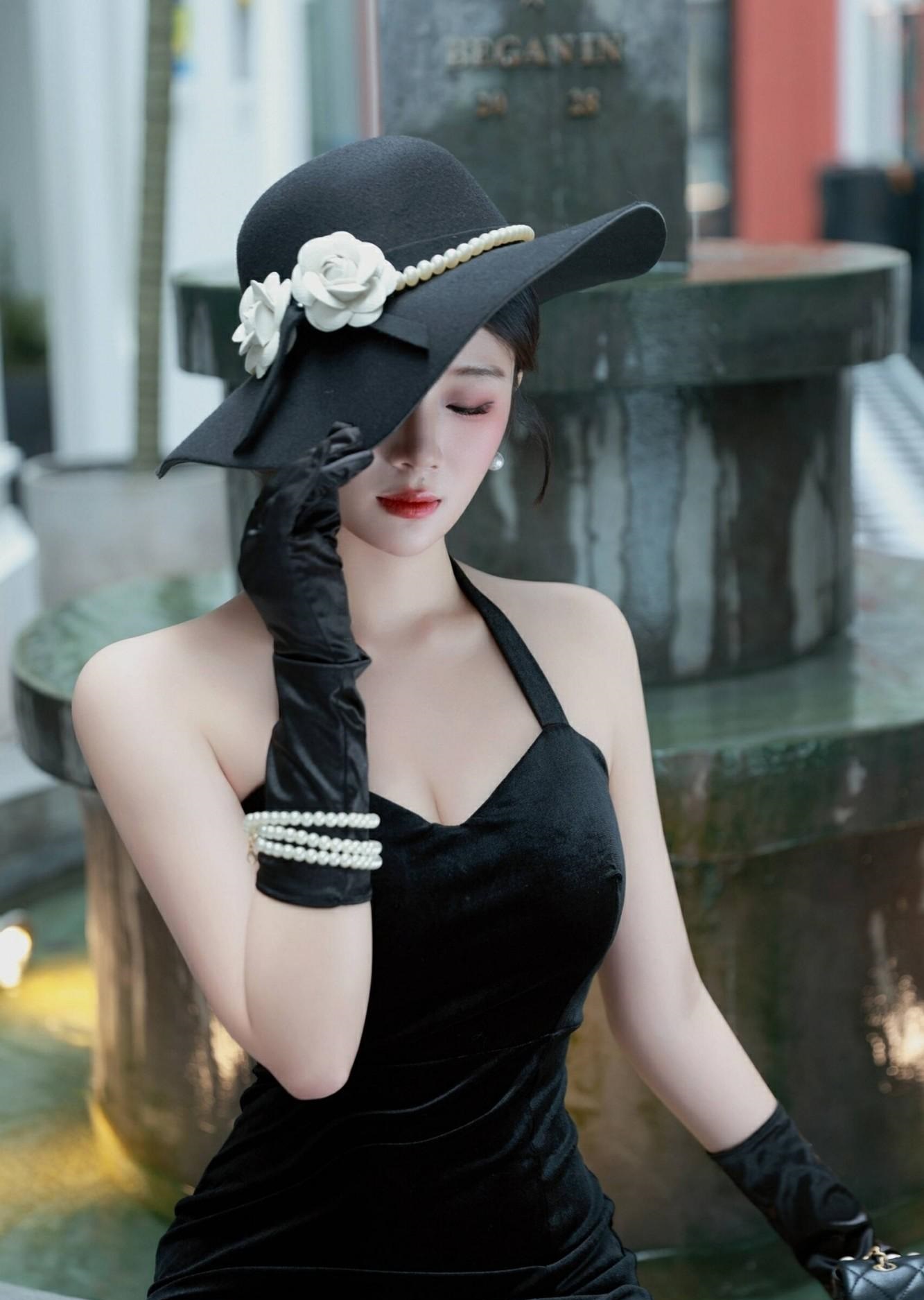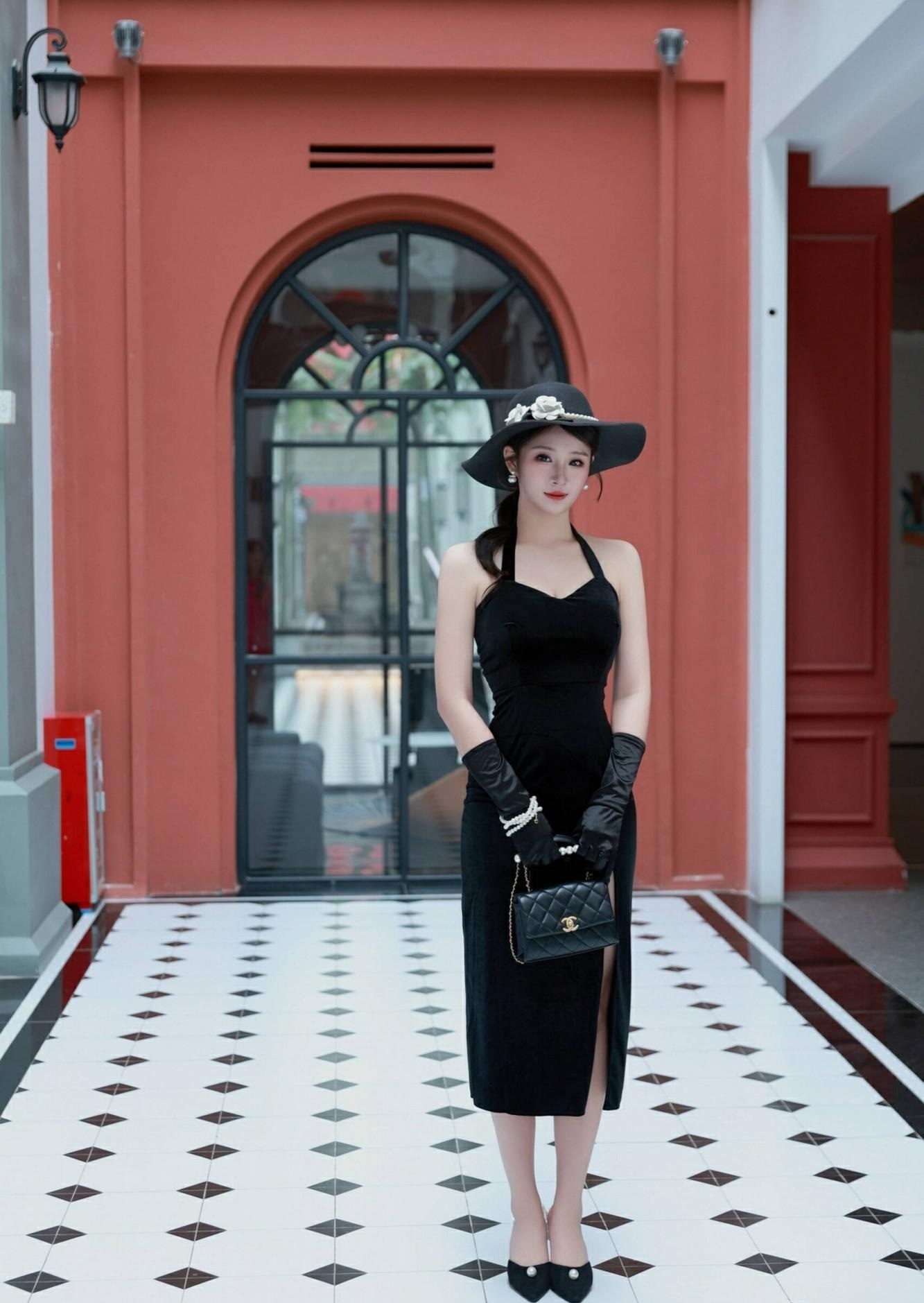 一袭黑色挂脖长裙,勾勒出曼妙身姿,开叉设计秀出修长美腿,每一步都摇曳生姿! 搭配黑色宽檐帽与长手套,复古优雅气息扑面而来,仿佛从旧时光走出的摩登女郎!