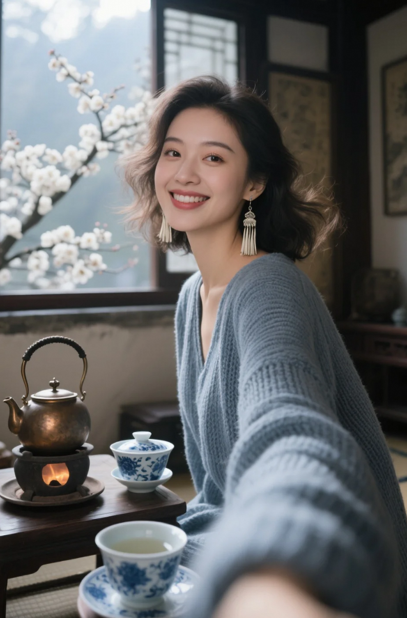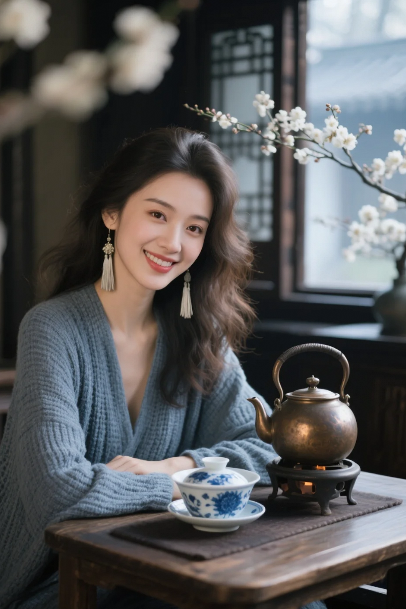 青花瓷上浮着茶雾,像一幅未完成的江南水墨