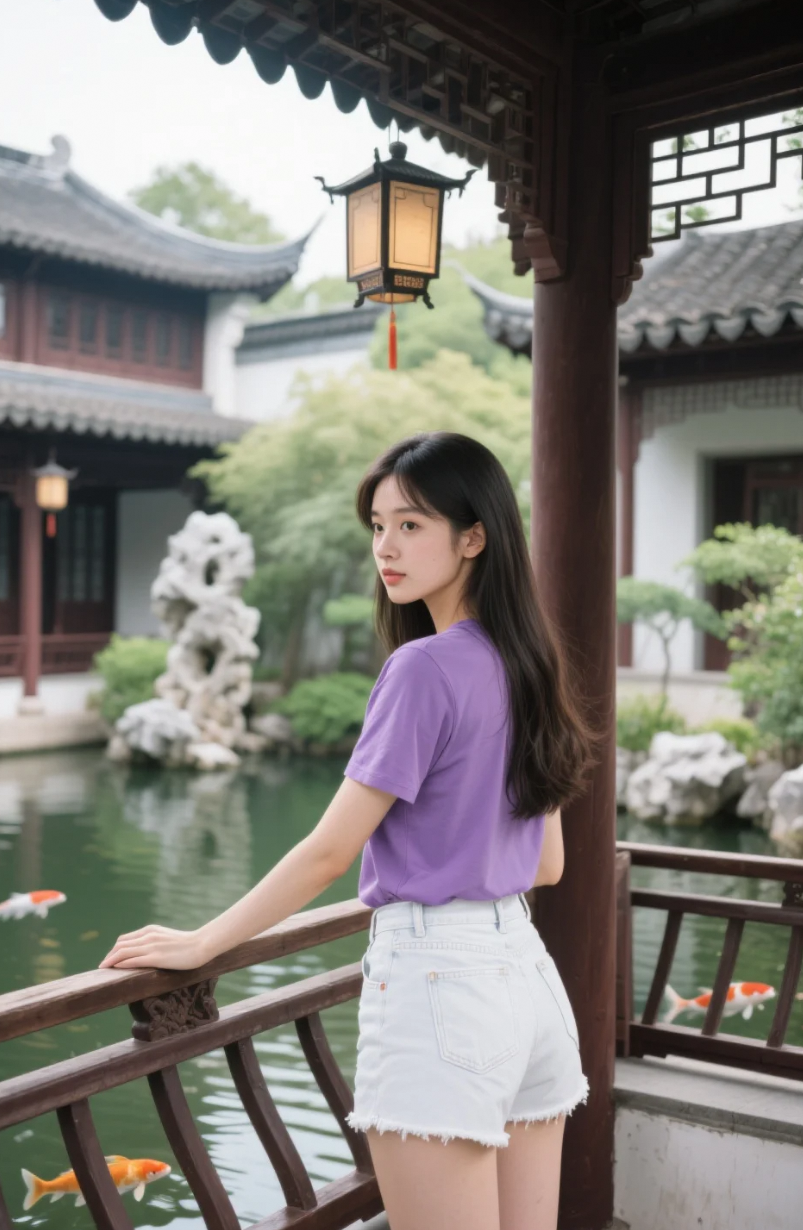 凉亭深处,她不言不语,却写尽了“岁月静好”