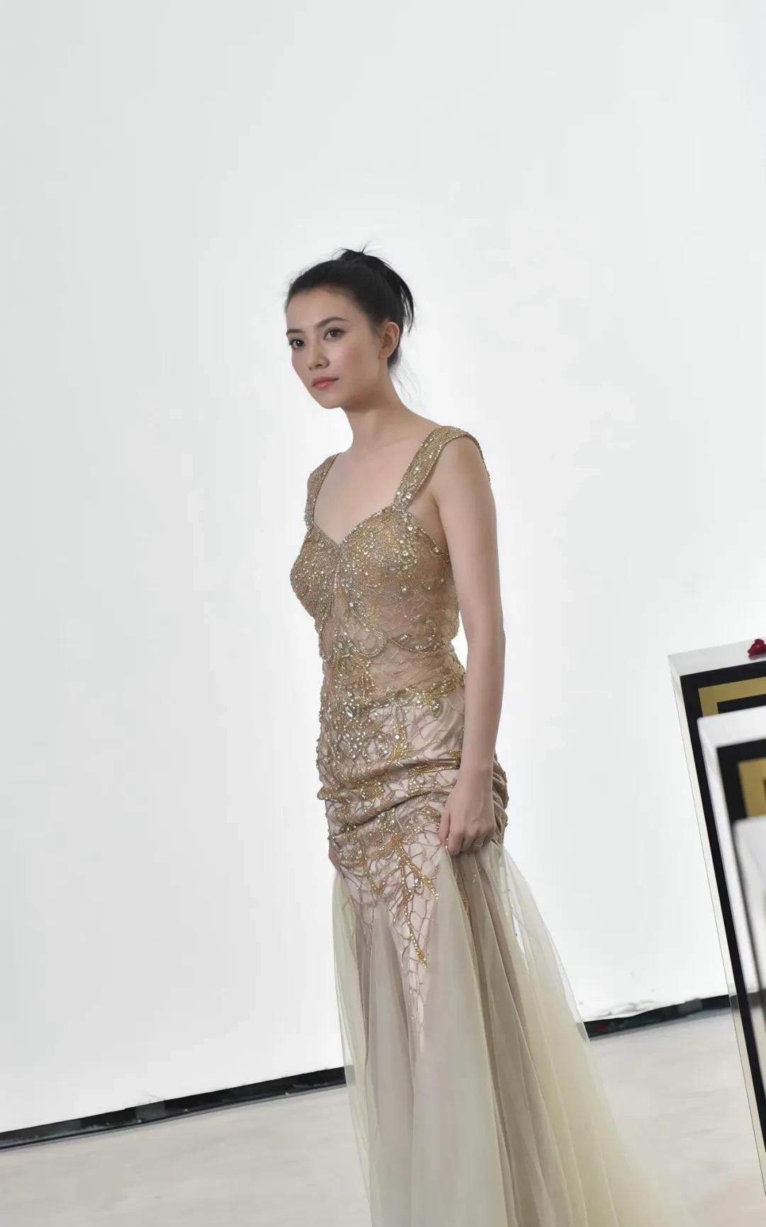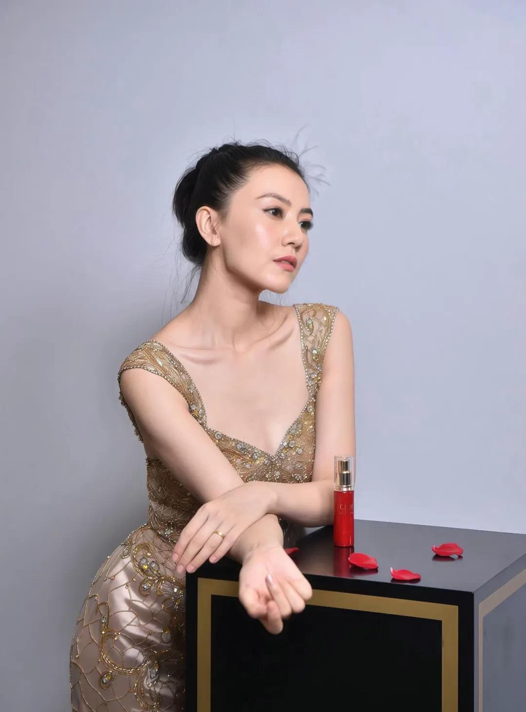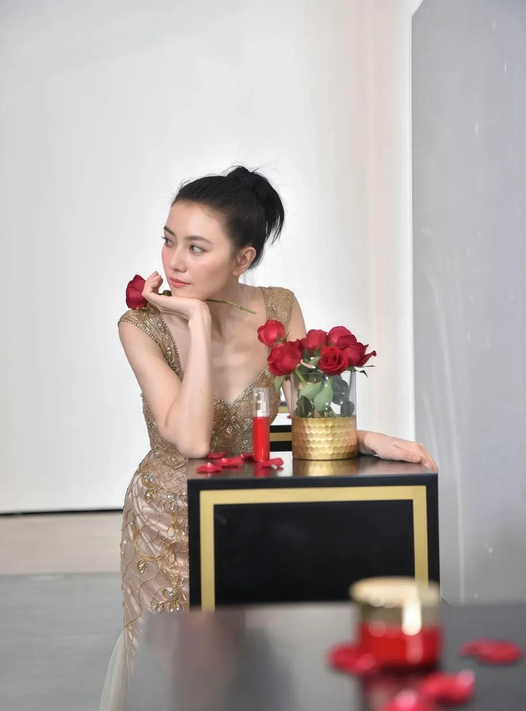 高圆圆穿鎏金礼服,身材曲线绝到逆天!皮肤白到发光,托腮、举瓶,每一下都把性感值拉