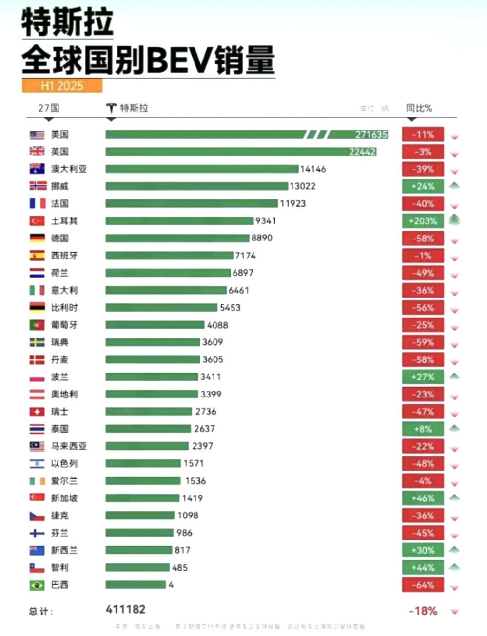 今年上半年,特斯拉不仅在美国市场销量下滑,在其进入的所有国家中,几乎都在下滑,在27个国家的总销量,卖了大约41.11万辆,同比暴跌18%。而在中国市场,上半年销量是26.34万辆,也就是说特斯拉在我国的销量,是在其它国家销量总和的一半以上,可想而知中国市场对特斯拉是多么的重要。