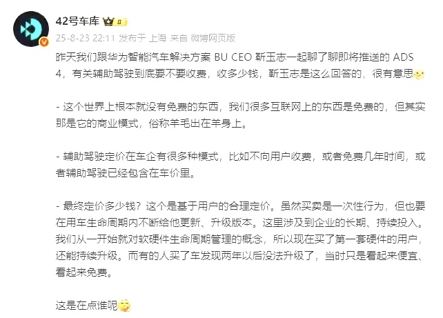 华为别扯了,自己不生产车,无法从硬件上赚钱而已。而其他厂商可以从硬件、售后、周边产品、系统广告、粉丝活动等等方面赚钱,不一定需要从智驾上赚钱。他要和车厂分配利润,这可能就是各种届价格贵的原因之一。