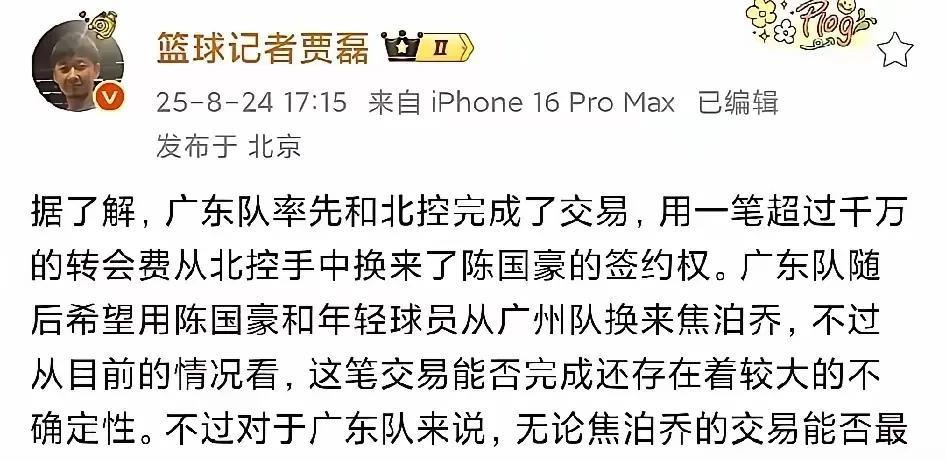 有惊无险!徐昕基本确定留在广东,焦泊乔不愿意加盟广东。据资深媒体爆料:主动提