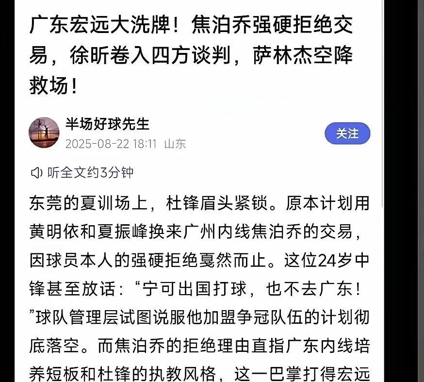 网传焦泊乔出国打球也不去广东,希望广东球迷不要误解焦泊乔。多从广东队自身找原因,才有利于球队吸纳更多优秀球员加入广东队,实现突破历史12冠 再回看张明池和徐昕为啥要离开广东队,所以网传广东队特别希望用到手的陈国豪再加其它球员,换来广州队的焦泊乔,当然也看到网传,乔泊乔下赛季去国外打球,也不愿加盟广东队,原因直白的说,杜锋家长式执教风格,大多有自尊心的球员,都不愿加盟广东队,不愿意受一些窝囊气。所以焦泊乔不愿来广东,也望广东球迷能理解,当然球员都想去能争冠,团队气氛又好的球队,这样球员也才能有更好发挥,大家认为呢? #头号创作者激励计划#