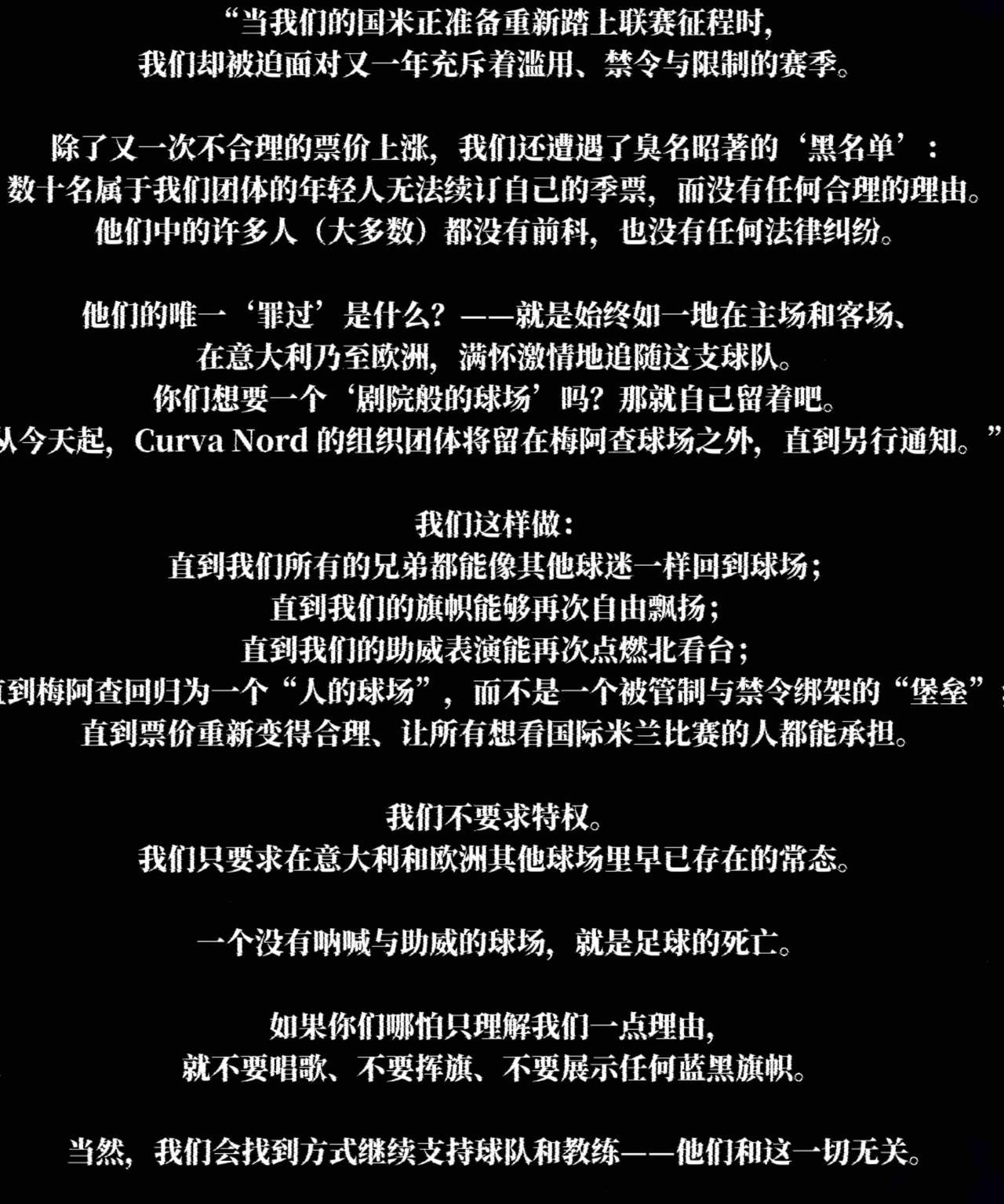 北看台宣布抵制梅阿查,让俱乐部拥有剧院球场 从今日起,国际米兰北看台的组织化球迷团体将彻底退出梅阿查,直至另行通知。 原因?票价再度无理上涨; “黑名单”阻止大批年轻 tifosi 续订季票;助威旗帜、编排被禁,球场逐渐沦为“剧院”。 他们的口号直击人心: “想要剧院球场?那就自己留着吧。” 没有 北看台的歌声与旗帜,梅阿查将变得冷清。一个没有呐喊的球场,就是足球的死亡。