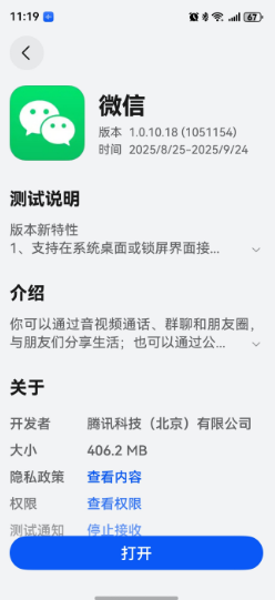微信鸿蒙版 App 今日晚间在华为应用市场(App Gallery)启动了版本号为 1.0.10.18(1051154)的邀测更新,该测试计划将持续至9月24日。本次升级引入了多项新功能,包括可在系统桌面或锁屏界面直接接听语音通话、支持将聊天记录迁移至电脑端、提供聊天记录存储空间管理功能,以及新增“搜一搜”等实用特性。我的设备为华为 Mate 70 Pro+,当前系统版本为 HarmonyOS NEXT 5.1.0.150 SP3。#爆料# #微信# #鸿蒙#