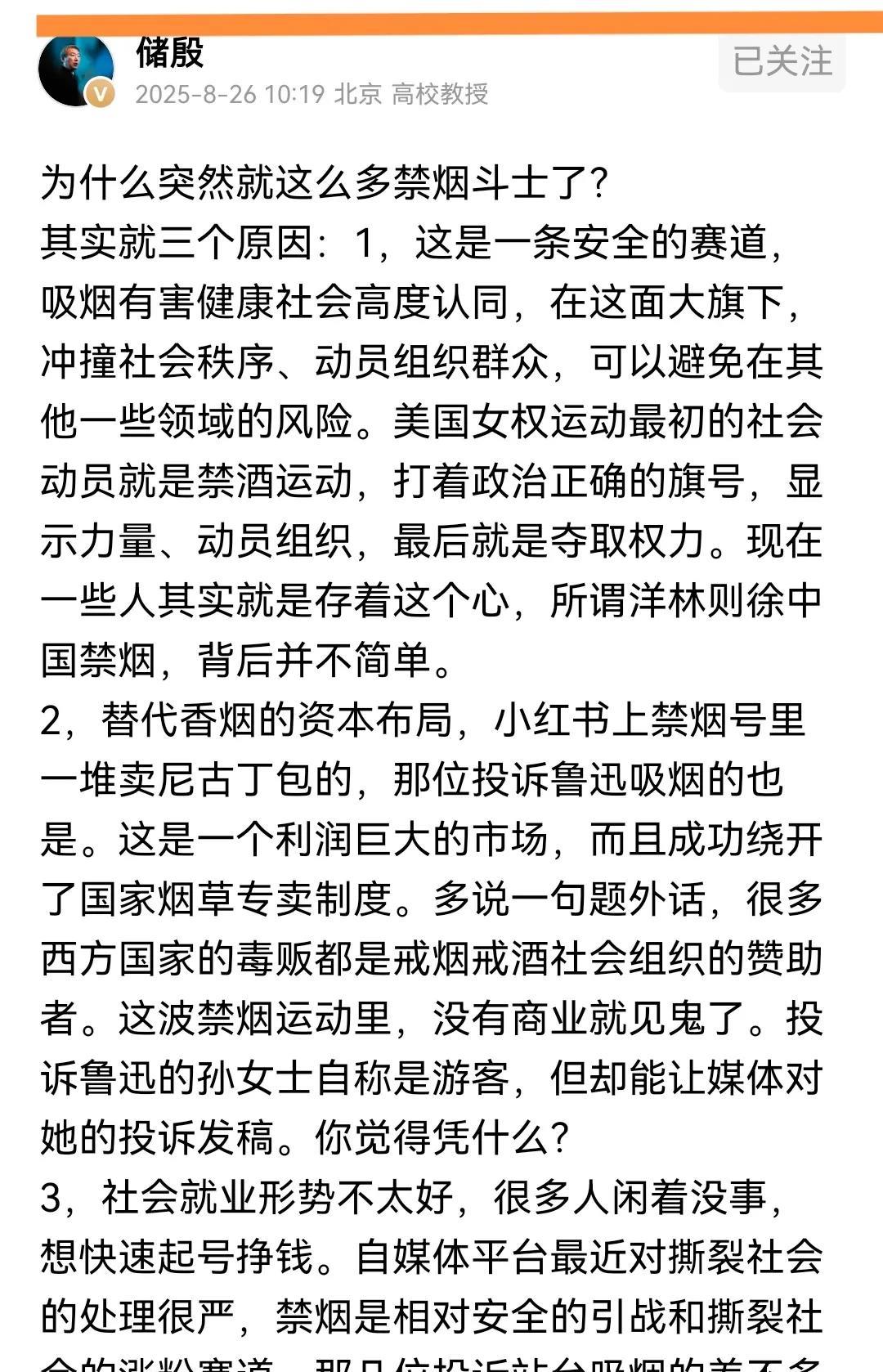 这事居然能跟女拳扯上关系?储殷教授书读得多,打拳果然功底深厚! 我简单查了一下资料,事情还真不简单! 19世纪后期,美国工业化引发酗酒泛滥,女性作为酗酒的主要受害者,成为禁酒运动的核心参与者。 1874年成立的基督教妇女禁酒联盟(WCTU),以“禁酒”为切入点,将女性从家庭领域引导至公共领域,通过集会、演讲、游说等方式扩大影响力。 该联盟不仅推动了多个州的禁酒立法,更成为当时美国最大的女性组织(1892年成员达15万人),为女权运动积累了组织经验和群众基础。 储殷教授虽然说得有根有据,但这顶帽子最好也不要随便乱扣,毕竟从官方到民间,控烟已经成了今天社会的主流共识了。 #女拳经济# #封杀女拳#