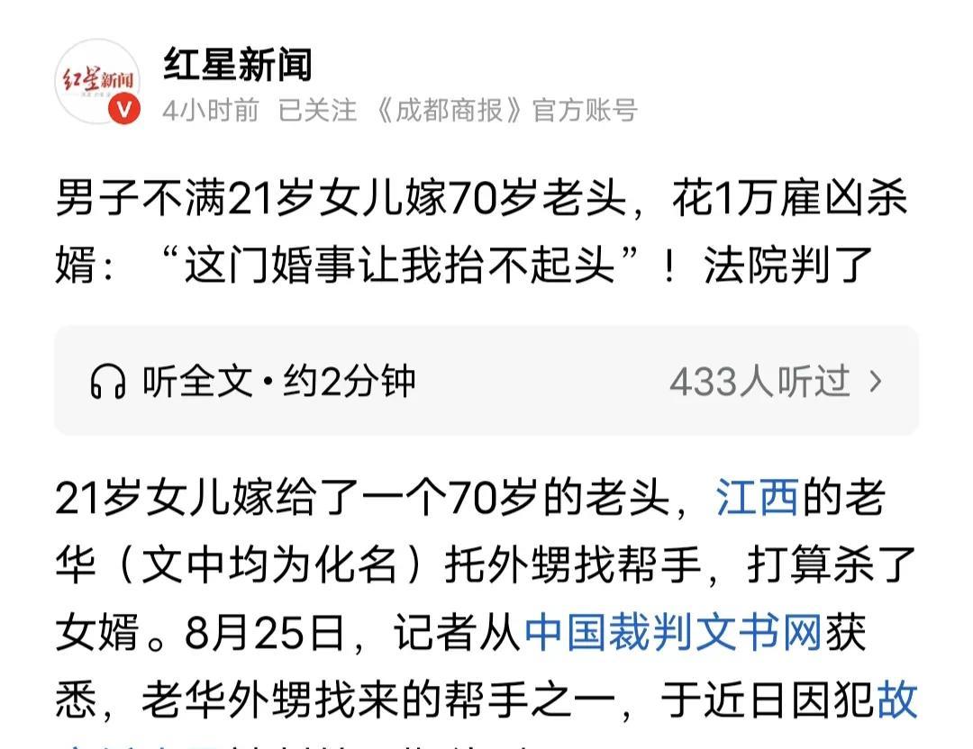 江西,男子的21岁女儿和一70岁老头登记结婚,男子嫌太丢脸,出10000元,让外甥雇凶把女婿杀喽,外甥找了3个人潜入70岁老头家,一顿乱砍,老头当场死亡,这下酿成悲剧了! 8月26日红星新闻报道一件让人惊掉下巴的事情,21岁的的妙龄女子嫁给一70岁老头子,岳父嫌脸没地方放,竟然花钱雇人干了一件荒唐事。 这要从1995年4月7日上午说起,事件的始作俑者老华(化名)遇到了外甥阿浩(化名),便把心里憋屈的事,向阿浩一顿输出。 老华心里憋屈,自己那21岁的女儿居然和一个70岁的老头老王领了结婚证,自己说什么都不同意。 年轻女孩嫁给老头,在1995年那个淳朴的年代一般很难被大家接受,老华也不例外,女儿这么做让他的老脸往哪放?一想到被人说女婿年纪堪比岳父,简直让他无法接受。 老华也强烈反对过女儿和老王结婚,后来,两人不顾阻拦结婚了,之后,不管老华如何反对,老王也不同意离婚。 老华非常气愤,他把烦恼一股脑儿倒了出来,为了除掉这个“老女婿”,他说出1万块钱,让阿浩找人把老王给杀了。 阿浩也是一个见钱眼开的,一听有钱,毫不犹豫的答应了。 之后,阿浩找了阿凯等三个人,商量一起除掉老王。 同年4月9日下午,阿浩和阿凯等4人,带着刀,跑到老王住的地方蹲点,阿浩认出了老王后,四个人开始悄悄的跟踪他,可是,跟着跟着竟然把人跟丢了。 到了晚上8点多,四人又来到老王住的地方,发现房门没有关,他们觉得机会来了,就像一群恶狼一样,依次冲进屋里,拿着刀对着老王一顿乱砍。 老王被这突如其来的攻击吓得大喊:“救命”,一边喊一边往没开灯的房间跑,不料,四人哪里肯放过他,追着他进了房间。 阿浩将老王打倒在地,四人拿刀对他砍,没一会儿,老王当场死亡。 案发后,阿凯怕被抓,化名到处逃窜,最后,跑到广东东莞躲了起来,一躲就是好多年,然而,天网恢恢疏而不漏,2023年10月20日下午,他被抓获。 这个案例中显示,老华已经被判决,而阿浩也被判决,但是没有具体透露。 有人说,这个事是看一个地方的风俗的,老华在风俗下丟了颜面,人言可畏!嫁个婿比自已都大一般人是受不了的。 21岁的时候找了个大4岁的男朋友 当时都觉得这已经是极限了 这个当时21岁女孩子是怎么想的非要嫁给一个70岁的老头? 也有人说,老头肯定有吸引女孩的地方,才会如此决定。比如老头特别有钱,又是晚年,如婚姻幸福,女孩后半辈子少奋斗很多年。 1、老华作为幕后主使,他要承担什么责任? 《刑法》第26条规定:组织、领导犯罪集团进行犯罪活动的,或者在共同犯罪中起主要作用的,是主犯。对于主犯,应当按照其所参与的或者组织、指挥的全部犯罪处罚。 老华虽未直接动手,但作为“雇凶者”,明确提出杀人意图并出资1万元,属于共同犯罪中的“主犯”。 本案中,老华因“面子问题”策划杀人,主观恶性极深,如果,最终被认定为主犯,量刑可能接近顶格处罚。 2、老华21岁女儿和70岁老头的婚姻是否受法律保护? 老华供述,他不同意女儿的婚事,女儿嫁给一个70岁的老头子,他让他抬不起头。 《民法典》第1046条规定:“结婚应当男女双方完全自愿,禁止任何一方对另一方加以强迫,禁止任何组织或者个人加以干涉。 老华女儿21岁了,到达了法定结婚年龄, 我国法律未规定婚姻年龄差限制,只要双方自愿且无禁止结婚的情形,如近亲属、未达法定婚龄、患有重大疾病未告知等,婚姻即合法有效。 老华女儿作为完全民事行为能力人,与70岁老头结婚不违反法律强制性规定。 老华不能以“年龄差大”“觉得丢脸”来破坏女儿婚姻。 3、阿凯是老华外甥找来的帮手之一,犯故意杀人罪。 《刑法》第232条规定:故意杀人的,处死刑、无期徒刑或者十年以上有期徒刑;情节较轻的,处三年以上十年以下有期徒刑。 阿凯在阿浩的邀集下,参与预谋并实施了持刀砍杀老王的行为,最终导致老王死亡。 主观方面:阿凯明知持刀砍人会致人死亡,仍积极参与,主观上具有杀人故意。 客观方面:阿凯与阿浩等人共同持刀追砍老王,致其当场死亡,客观上完成了杀人行为。 阿凯在案发后化名潜逃28年,虽不影响故意杀人罪的成立,但可能被认定为“逃避法律追究”,在量刑时作为从重情节考虑。 不过,本案中法院已根据其从犯地位从轻处罚。 最终,法院一审,判处阿凯无期徒刑。 阿凯不服上诉,二审维持原判。 关注@福康说法 从日常点滴学法律,生活安稳更有底
