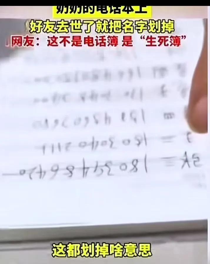 哭笑不得!这天,孙子看到奶奶把电话本上的名字给划掉,问奶奶为什么要这样做?奶奶的回答,让孙子心里发毛,直呼:“你这哪是电话薄,你这是生死薄!上面没有我的名字吧?”网友:虽然很好笑,但奶奶心里肯定很难受吧…… 奶奶记性不好,也不会存号码,就把朋友的号码现在记事本上。 这天奶奶坐在客厅拿着笔,把上面的一个号码给划掉了。 孙子看到很疑惑,上面不止一个号码被划掉,而是好几个。 于是他忍不住问奶奶为什么划了?是跟他们关系闹僵了吗? 可没想到奶奶说:“划掉都死了!” 孙子听得一愣一愣的,再看到一个叫老刘的只划了一半,问奶奶这又是什么意思? 奶奶说:“老刘也快了,病的厉害了……” 孙子心里一紧,问:“这上面有我的名字没有?你这怪吓人的,你这马上赶上生死薄了!” 此事引发了热议,有网友说,老刘:我觉得我还可以抢救一下,不要画我,球球了! 也有网友说,哈哈哈,太真实了!阎王爷划谁谁死,奶奶谁死划谁! 还有网友说,我奶奶说她做梦总梦到死人,这不废话吗,她今年97,她认识的那些老街坊和亲戚,基本都死了! 我想说的是,奶奶这电话本太真实了!这里面藏着一整个旧时光,划掉的是一个个熟悉的人,没划的是心里记挂的念想,这才是最实在的生活记录! 老一辈的念想都在这些小细节里,看着又暖又有点鼻酸。 这种方式告别很残忍的,我手机删除了好几个了,说起来好像也没啥,但真正自己动手的时候确实犹豫的,因为一旦删了就代表永远的告别了。 奶奶说的波澜不惊,心理其实早就五味杂陈了。上了年纪,距离死亡更进,心里的畏惧与日剧增,但每个人都有这个过程……#头号创作者激励计划#