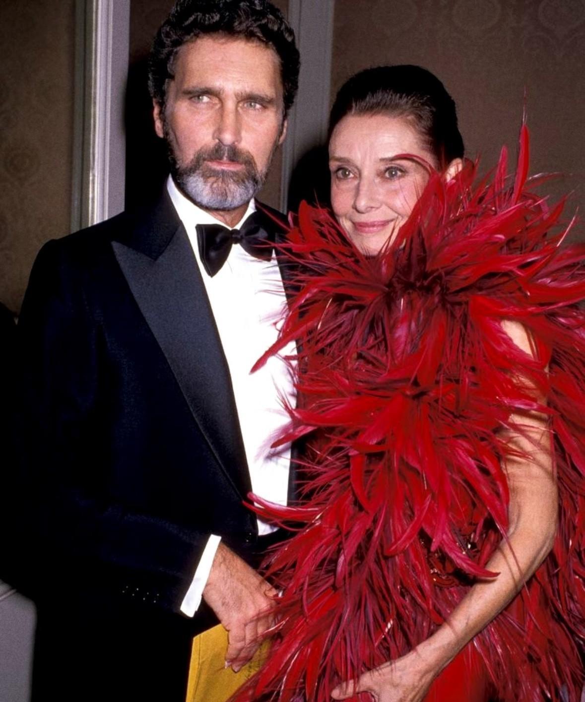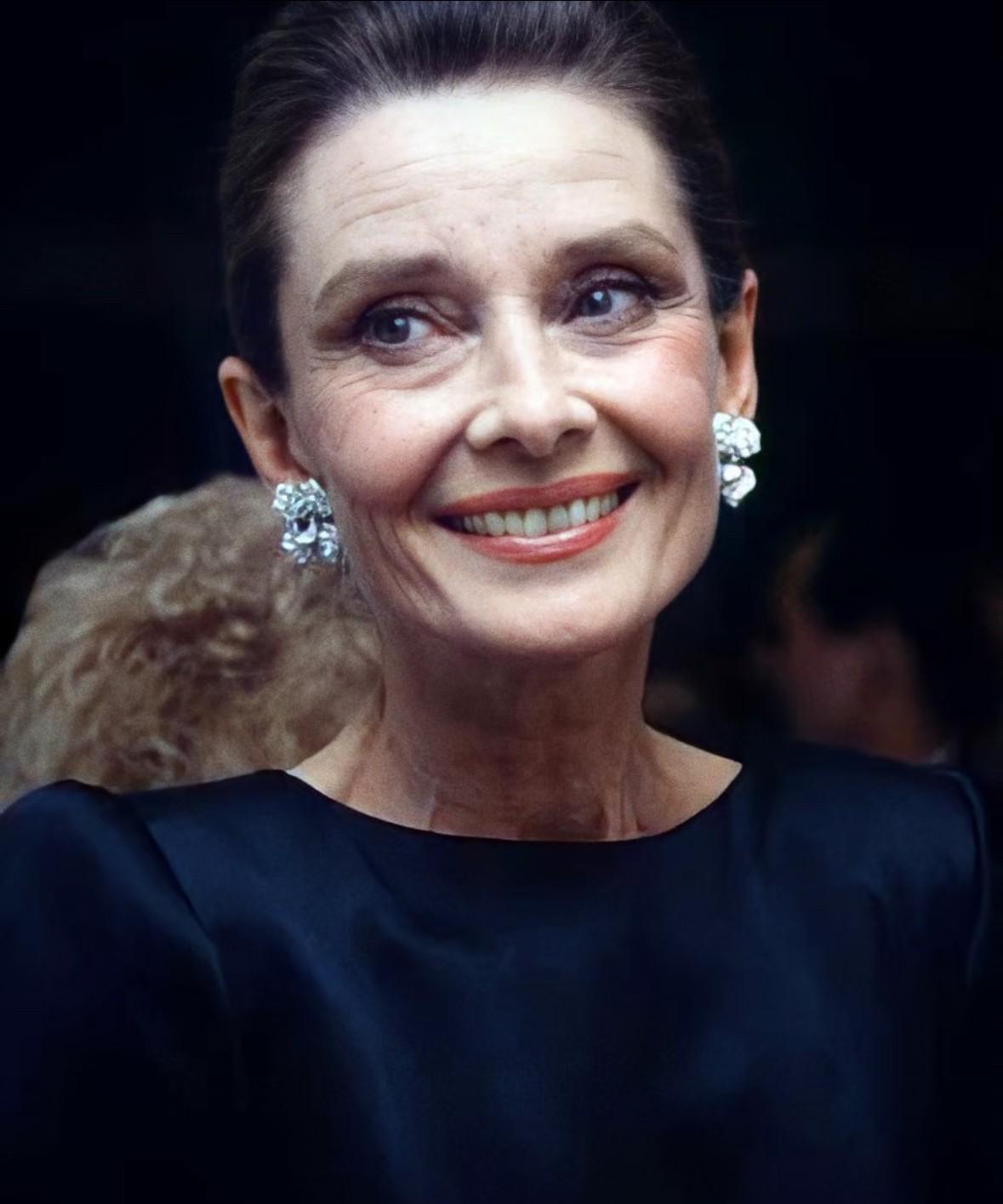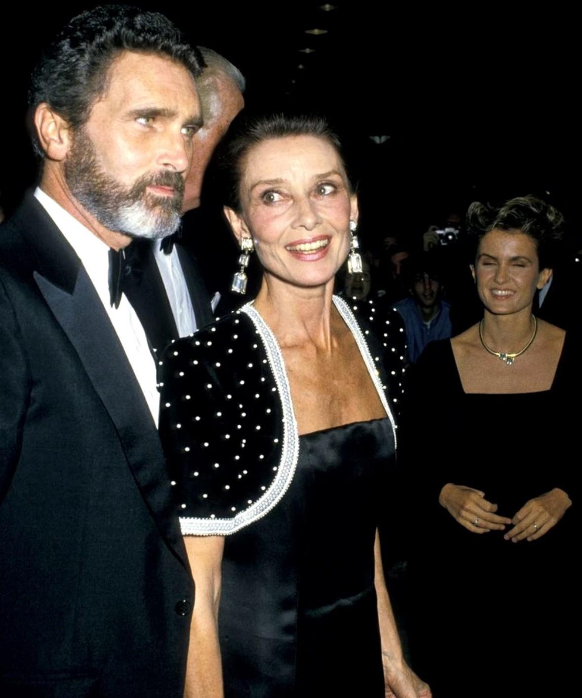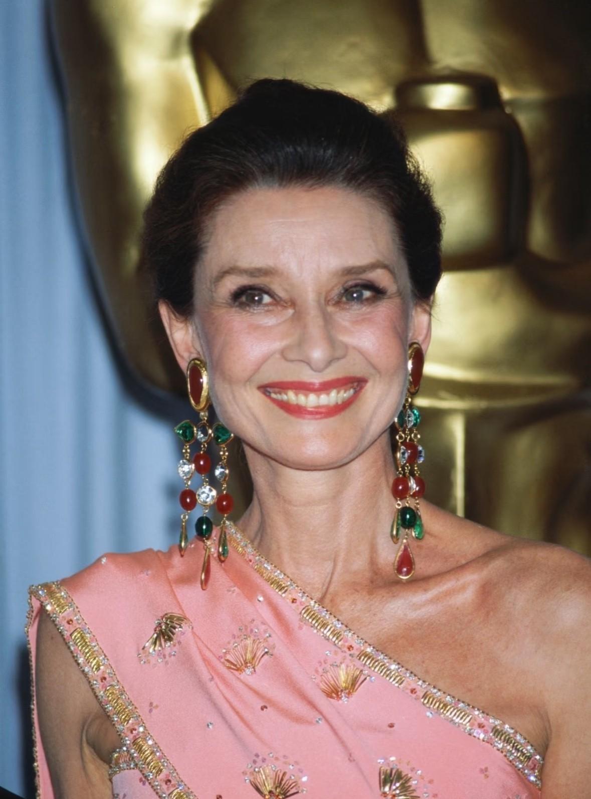 1987年奥斯卡颁奖礼上,奥黛丽·赫本已经年过半百,但是她一袭斜肩桃粉色礼服亮相