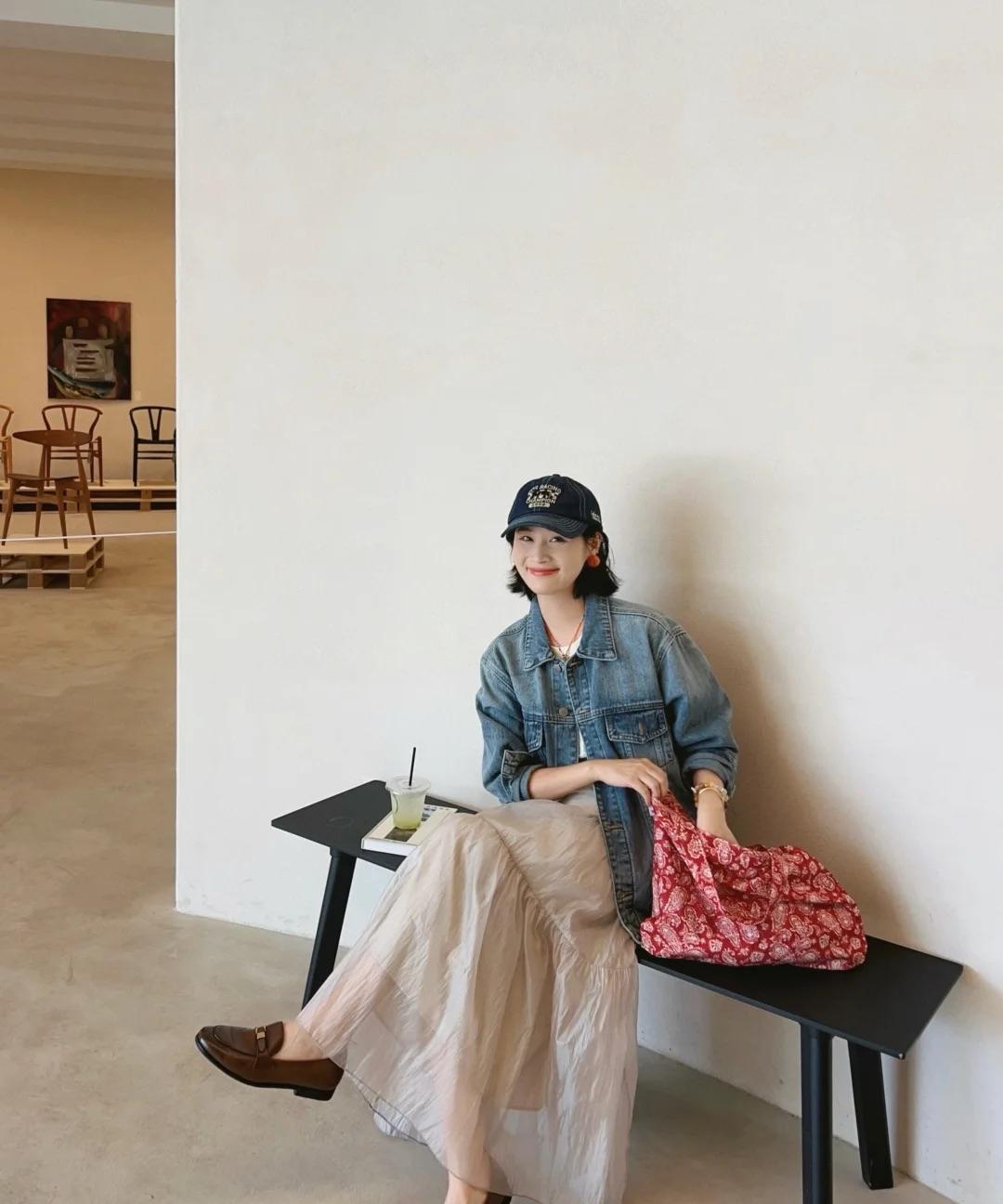 入秋后就这么穿吧,宽松的牛仔外套配长裙,娘man平衡时髦漂亮! 是廓形的男友风牛仔外套,搭配一条浅灰色的及踝纱裙,增加甜美的氛围感,不同材质的混搭还更有层次。 搭配一只红色的帆布包更文艺,提亮又时髦!