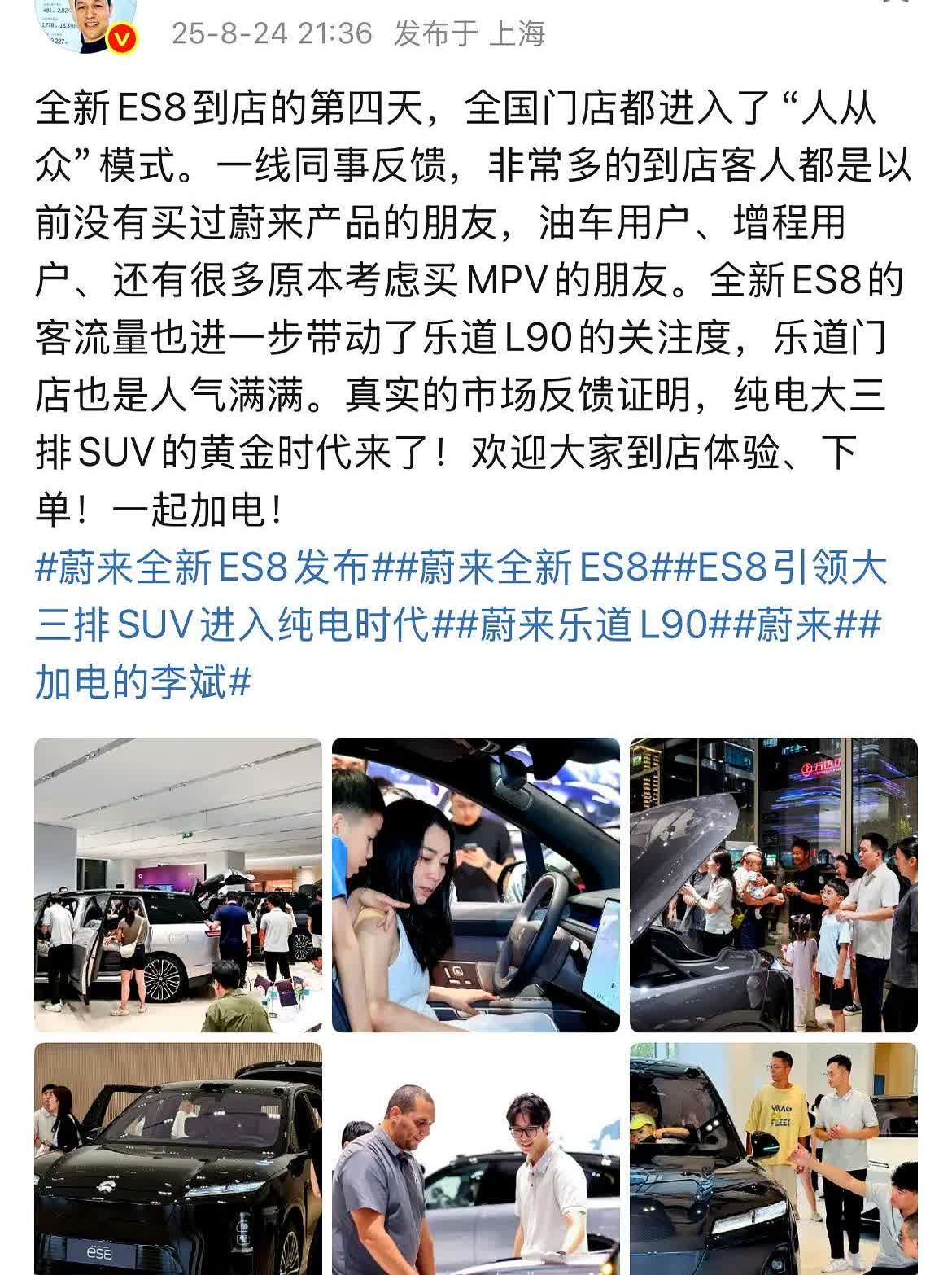 三天没动静的李斌突然发声,ES8订单已破十万,纯电大三排SUV的黄金时代真来了? 上周末,全国蔚来门店挤爆,试驾排队到商场打烊。 李斌没报数字,但内部线报:ES8锁单量已把同期乐道甩出几条街。 价格一改,市场直接投票。 过去嫌贵的人,如今刷卡不带眨眼。 三排纯电SUV早被喊伪需求,现在成了家庭刚需,六座、七座、能换电,一个都不能少。 十万订单背后,是家庭结构变了。 二胎三胎加老人,五座车塞不下,油价又居高不下,一块绿牌直接省掉全年油费。 别只盯着数字。 产能能不能跟上,交付会不会拖,换电站够不够,才是下一道坎。 订单爽一时,体验翻车只需一次排队充电。