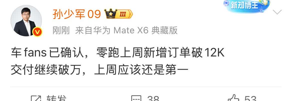 稳扎稳打! 孙少军:车fans已确认,零跑上周新增订单破12K!