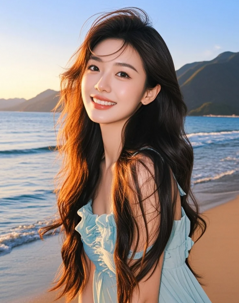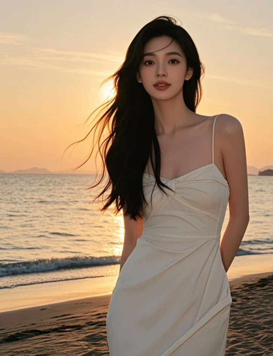 沙滩漫步,长发女神迎着海风,姿态轻盈,诗意流淌心间
