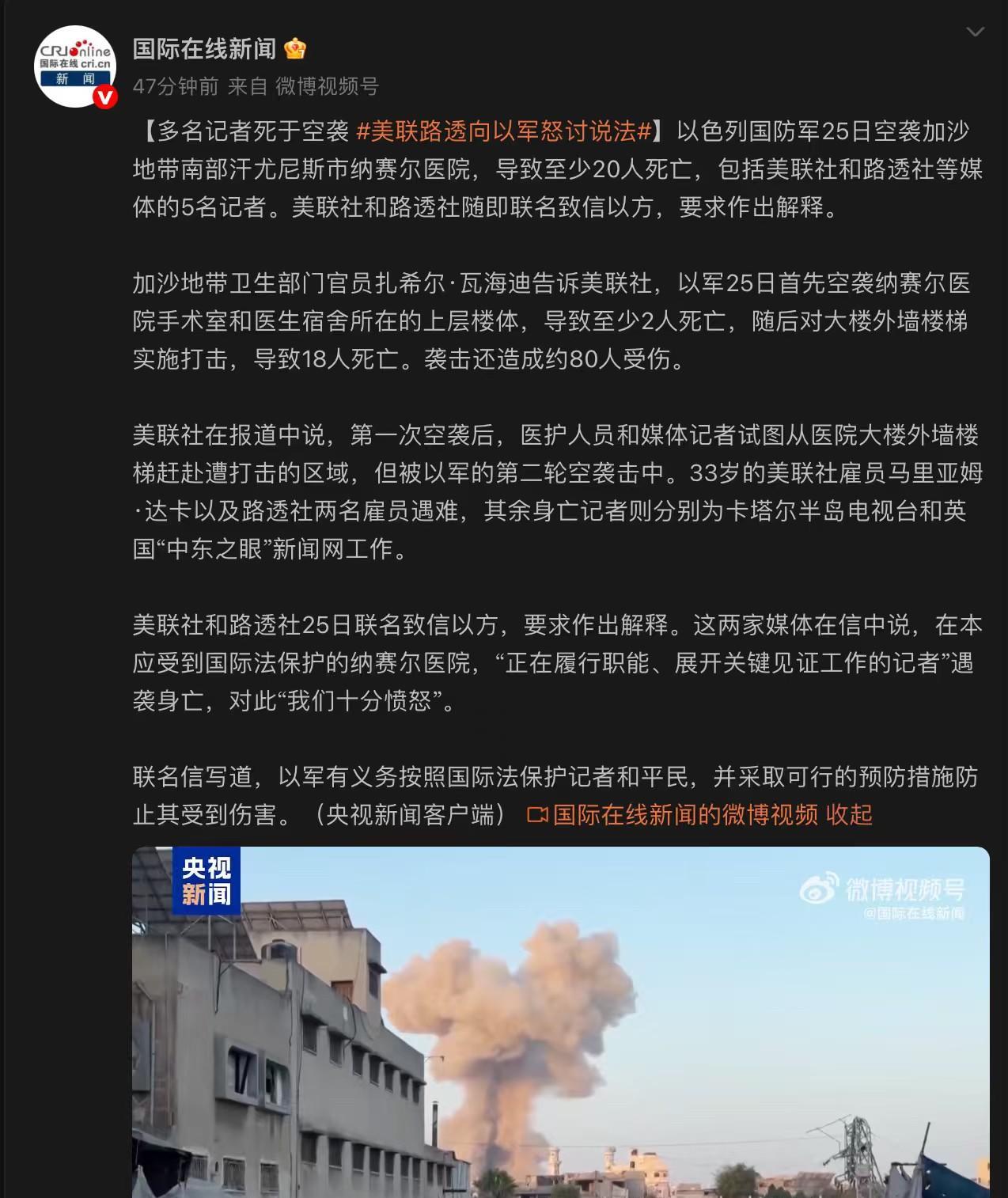小鱿子一发炮弹带走多位正在直播拍摄的记者和医生,这股狠辣劲儿简直毫无人性。当地时间8月25日,一行记者正在直播拍摄汗尤尼斯战事时,被小鱿子明目张胆的用炮弹袭击,并在后续袭击中直接带走包括医生和记者在内的18人,还造成了约80人受伤。没想到这一幕正好被人给拍摄了下来,这也是我第一次看到真实的炮弹带走大活人。从现场拍摄的画面来看,连坚固的专业相机都被炸得破破烂烂,由此可见其威力有多大。这种丧心病狂的做法,简直令人发指,我有十分的直觉,小鱿子这是在给自己挖坑,以后他们的下场会比这悲惨十倍! #我的宝藏兴趣# #综合摄影#