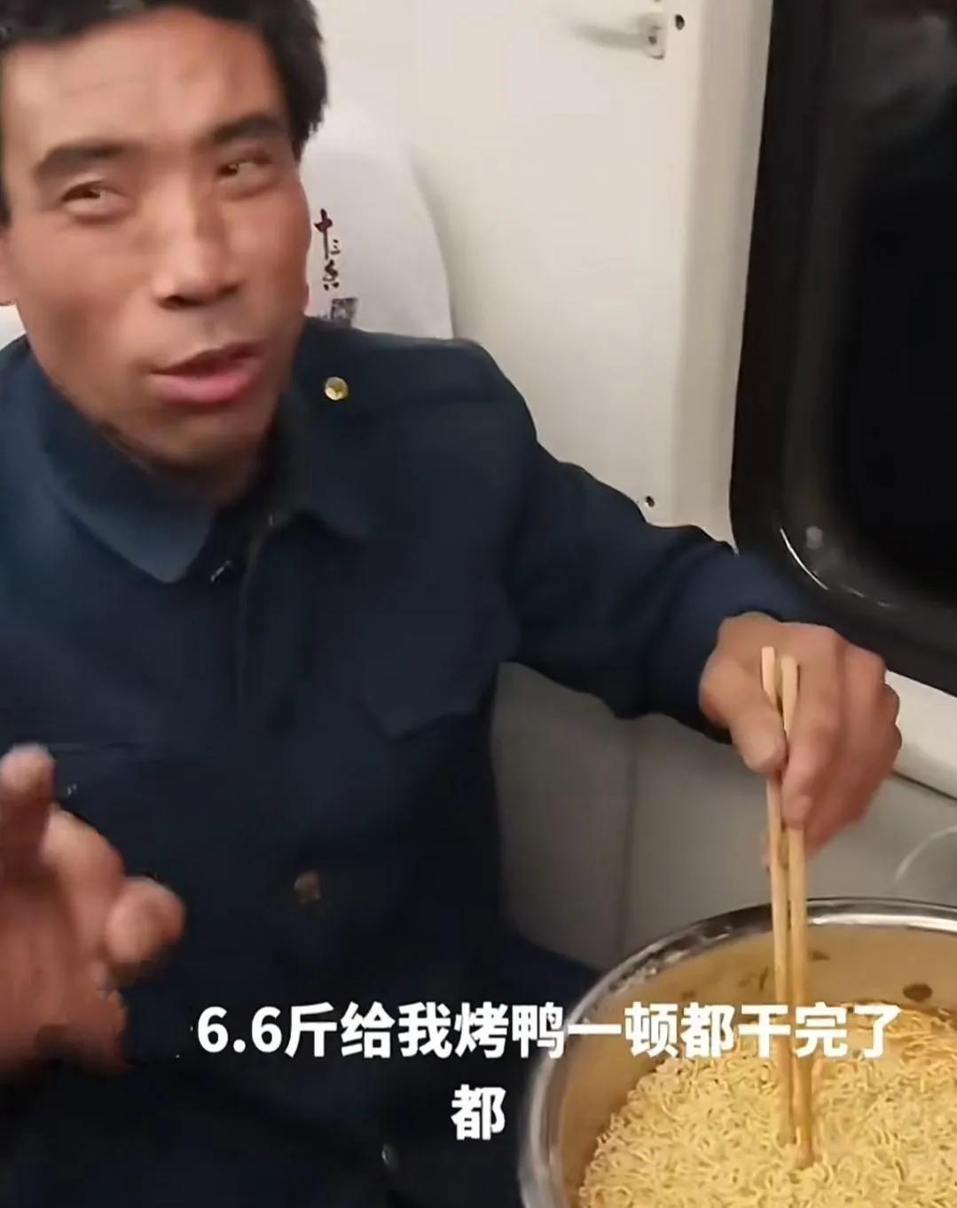 在宁波到郑州的绿皮火车上,一名农民工,一次性在一个大盘子里泡了10包方便面。 车上的人都说他吃不掉,可是他说这食量是正常的量,他还说,如果自己干活多的话,自己能吃一只6.6斤的烤鸭。 大佬胖胖熊点评: 我看这个大哥,肯定是重干体力活的人,我们可以想象在建筑工地上工作,长期干体力活,所以消耗肯定比较大,自然吃的比较多了! 我记得小时候村里很穷,那时候的人还特别的能吃,一个饭量比一个大,人还特别瘦。 现在条件好了,不缺吃的了,大家一个个反而吃不下了,还一个比一个胖,回去几次家里有亲戚朋友来,都是一小碗饭,再添都不要,说现在吃不下了。