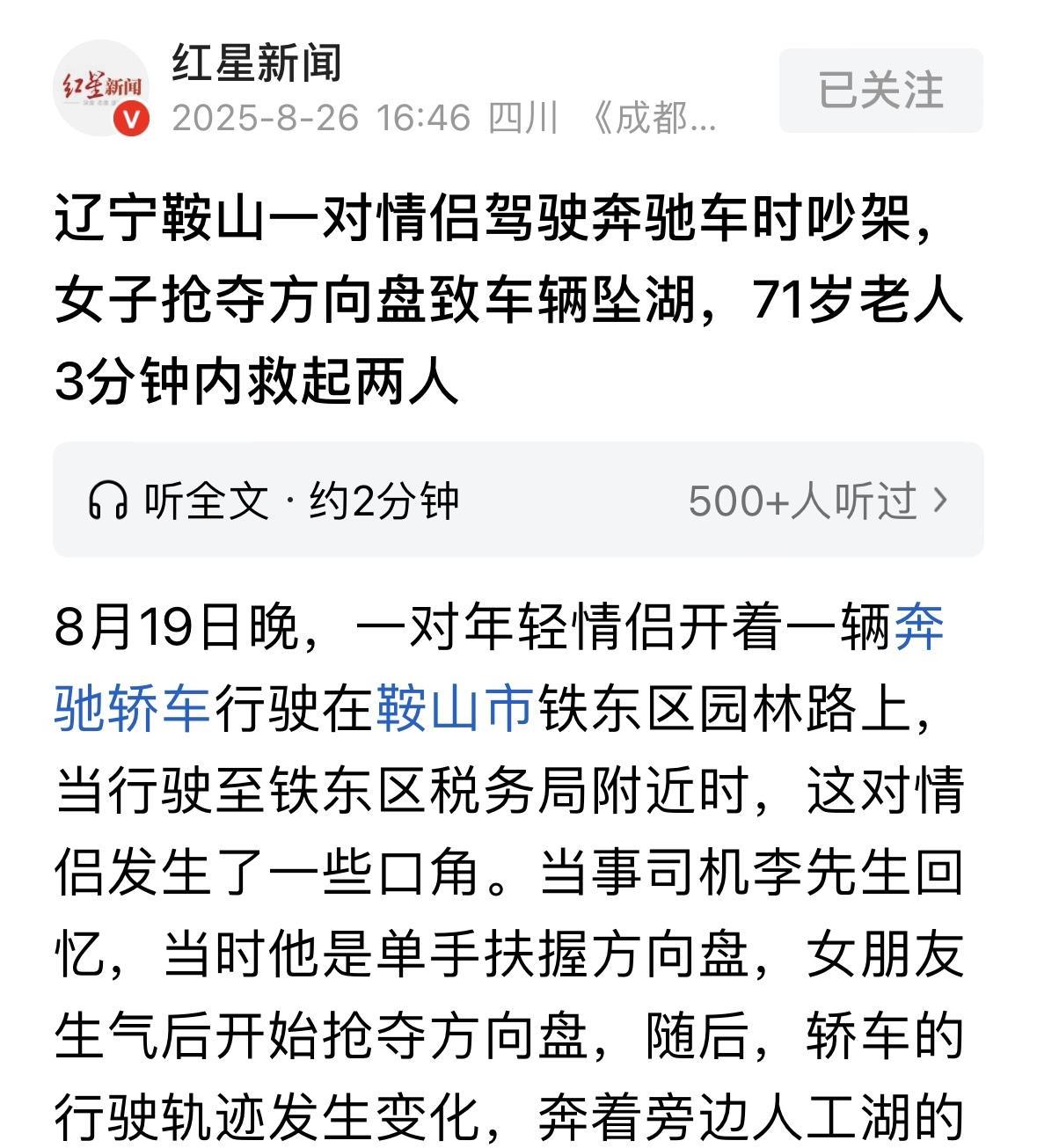 辽宁鞍山,男子开车时和副驾上的女友起了争执,女友情绪一上头,竟不管不顾伸手抢方向盘,导致车不受控制直接冲向湖里,男子原以为要交代在这了,谁知危急时刻,71岁老人拼命划着小船冲进湖里救人,仅用3分钟的功夫就把两人救上了岸。网友:远离要你命的人,感恩救你命的人。 据红星新闻报道,8月19号晚上,李先生(化名)开着奔驰车,载着女朋友行驶在路上。 车开到某地时,2人因为一点小事起了争执。 当时李先生单手扶着方向盘,女友一生气,不管不顾地突然伸手来抢方向盘。 接着方向盘一歪,李先生完全失去了控制,车直接冲着路边的人工湖护栏撞了过去。 “砰”一声巨响,轿车撞断护栏,一头扎进了5米多深的湖水里。湖水瞬间涌进车内,车身迅速下沉。 李先生慌了神,拼命想打开车门,可水压太大,门根本推不动。女朋友更是吓得整个人僵在座位上,连哭都哭不出声。 当时,在湖边负责维护清理的71岁老人王维民听到巨响后,立刻冲出屋子。借着路灯的光,他看见一辆轿车正沉在湖里,车顶快被水淹没了。 老人当即反应过来,这是有人落水了,他也顾不上穿外衣,抓起岸边的小船和铁锹就往湖边跑。 王维民今年71岁,平时在人工湖附近做维护工作,划船技术很熟练。 可这次情况紧急,他一边划桨一边喊:撑住!我来救你们! 老人知道这时候时间不等人,他不能耽搁哪怕一秒,所以他拼命划桨,只用了1分钟的功夫,就赶到了轿车旁边。 老人回忆,当时车里水快漫到脖子了,小伙子先爬了出来。 李先生当时吓得手脚发软,老人赶紧伸手拽住他,说你别慌,踩着我的船帮上! 李先生踉跄着爬上小船,瘫坐在船板上直喘气。 没等老人喘口气,李先生说自己的女朋友还困在后排座位上,请老人帮忙也救救女友。 老人一听,赶紧把铁锹伸进车窗,让女孩抓住铁锹头,说你别怕,抓住这个,我拉你出来! 可女孩吓得魂都没了,身体僵硬,根本使不上劲。 老人用语言指挥,说你慢慢往我这边挪,脚踩着座椅靠背! 女孩听了,一点一点挪动身体,终于抓住了铁锹。老人用力一拉,把她拽上了船。 老人王维民事后回忆,整个过程就3分钟,但每一秒都像过了一年。当时湖水太深,如果绕开湖中间的电线去救人,哪怕只耽误1分钟,那后果都不堪设想。 事后,李先生和女朋友被送往医院检查,所幸只是受了些惊吓,身体并无大碍。 2人对王维民老人千恩万谢,说要不是您,我们俩这条命就没了! 面对采访,王维民老人摆摆手,笑得憨厚,说自己当时啥都没想,就想着人命关天,晚一秒都不行。 有人看后说,这种性格偏激的女人,建议及时止损,趁早分了,这种情绪不稳定的,抢方盘的女人,随时能让你送命! 这女人在行驶途中抢夺方向盘,对他人造成危险隐患,涉嫌犯罪,应该追究刑事责任,哪怕够不上刑事犯罪,也至少要对她行政处罚,以儆效尤。 希望这个女孩从中吸取教训,也为救人的老先生点赞!七十多岁的老人,救了两条人命,这是天大的恩情。 那么,从法律角度来看,女友抢夺方向盘的行为是否违法? 《道路交通安全法》第22条第3款规定:任何人不得强迫、指使、纵容驾驶人违反道路交通安全法律、法规和机动车安全驾驶要求驾驶机动车。 案例中,女友因争执情绪激动,强行抢夺正在行驶中的车辆方向盘,导致车辆失控坠湖。 抢夺方向盘直接干扰驾驶人正常操作,属于“强迫驾驶人违规驾驶”的典型行为。 这个行为不仅违反交通安全法规,还涉嫌以危险方法危害公共安全,如果造成严重后果,可能触犯刑事犯罪。 即使没有造成重伤或死亡,也可依据《治安管理处罚法》第23条,以“扰乱公共交通工具秩序”处五日以上十日以下拘留。 那驾驶人李先生对这件事有没有责任? 李先生在驾驶过程中单手扶方向盘,没有尽到“安全驾驶”的注意义务,虽然因女友抢夺导致事故,但其自身操作不规范,如未双手握盘、未及时停车处理争执,同样存在过错。 如果女友抢夺方向盘仅造成车辆损坏,公安可对其行政处罚,同时李先生可向女友主张民事赔偿,比如车辆维修费、救援费等… 《民法典》第184条规定:因自愿实施紧急救助行为造成受助人损害的,救助人不承担民事责任。 案例中,71岁老人没有采取安全防护措施的情况下,划船冲入5米深的湖中救援,过程中可能因船只颠簸、体力不支等导致自身或受助人受伤,如划伤、落水二次风险。 不过根据规定,只要救助行为出于自愿且为紧急情况所必需,即使造成受助人轻微损害,救助人也不承担民事责任。 对此,你怎么看? 关注@运良说法 学法律知识不迷路 #头号创作者激励计划#