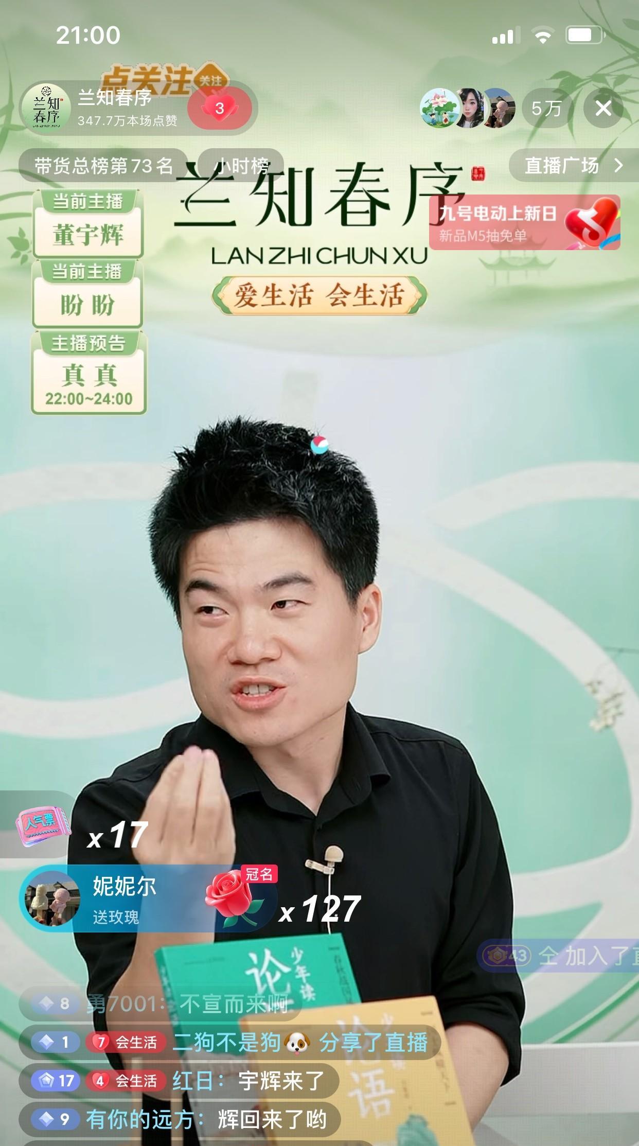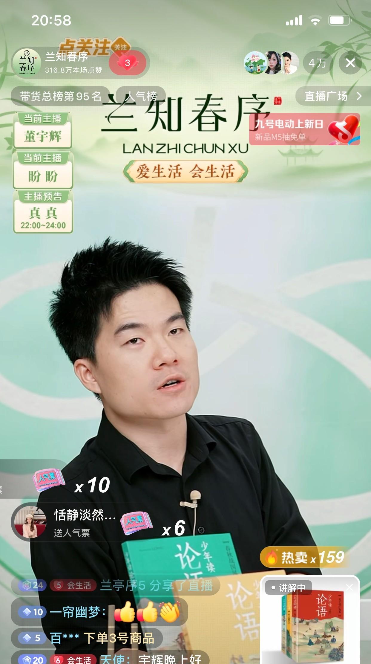 谁能想到快到九点又有大惊喜!彪哥一到讲书时间就忍不住自动现身! 兰知春序今晚讲书时间是盼盼主讲 讲到论语的时候谁也想不到 昨晚刚刚请假的宇辉又出现了! 看来要出差的时间还没有到 看到盼盼讲《论语》止不住就又出现在直播间 讲论语什么时候读有用, 讲要交什么样的朋友, 讲儒家思想百家争鸣的时候更有思想活力 和宋明儒家禁锢的思想不太一样! 讲叔本华的人生哲学! 讲人生要有自我的判断, 不要动摇自己在朋友之间的评价! 要悦纳自己,要积极的看待自己, 积极的看待别人对自己的评价, 要保持理性的认知! 在长期的相处之下不要过度自信! 也不要过度的谦虚和过度的忍耐! 很多人生经验给孩子讲他听不懂, 只有社会的教育才是成年人遭遇成长的意义! 缺乏有支撑力的观点在孩子面前是无力的! 看来,只要遇到讲述时刻 还是可以好好享受这样的惊喜! 只不过出差明天就出发了, 今天临时有事没走成! 讲述给孩子听就是给家长听, 不知道有多少家长能听到这些内容, 真的是对孩子有用! 祝明天出差的彪哥一路顺利! 期待下一次直播间再次相遇! 你期待吗?